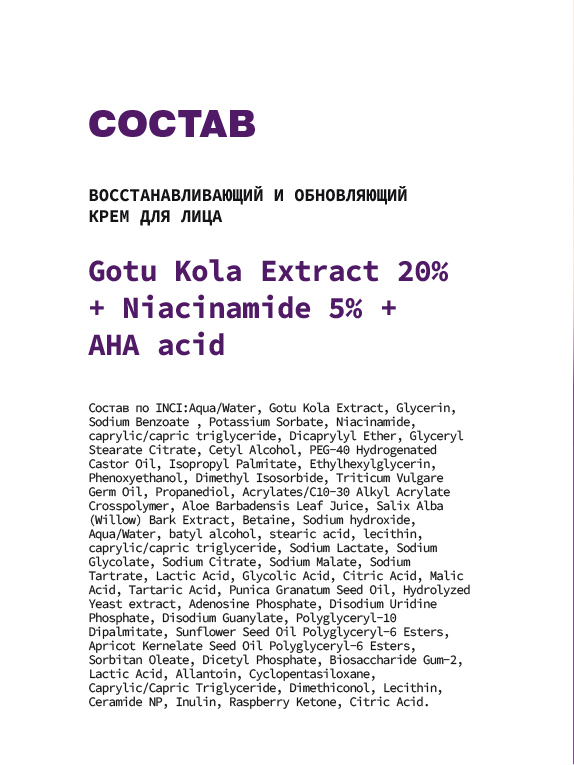 Состав:Aqua/Water, Gotu Kola Extract, Glycerin, Sodium Benzoate , Potassium Sorbate, Niacinamide, caprylic/capric triglyceride, Dicaprylyl Ether, Glyceryl Stearate Citrate, Cetyl Alcohol, PEG-40 Hydrogenated Castor Oil, Isopropyl Palmitate, Ethylhexylglyc