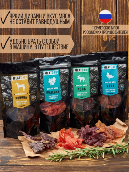 Состав:Вяленая индейка - 100 гр.; вяленая конина - 100 гр.; вяленая утятина - 100 гр.; вяленая лосятина - 100 гр.Комплектация:Вакуум упаковка; вяленая индейка - 100 гр.; вяленая конина - 100 гр.; вяленая утятина - 100 гр.; вяленая лосятина - 100 гр.Описан