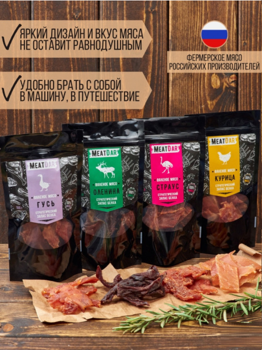 Состав:Вяленая оленина - 100гр.; вяленая гусятина - 100 гр.; вяленый страус - 100 гр.; вяленое курица - 100 гр.Комплектация:Вакуум упаковка; вяленая оленина - 100гр.; вяленая гусятина - 100 гр.; вяленый страус - 100 гр.; вяленое курица - 100 гр.Описание:О