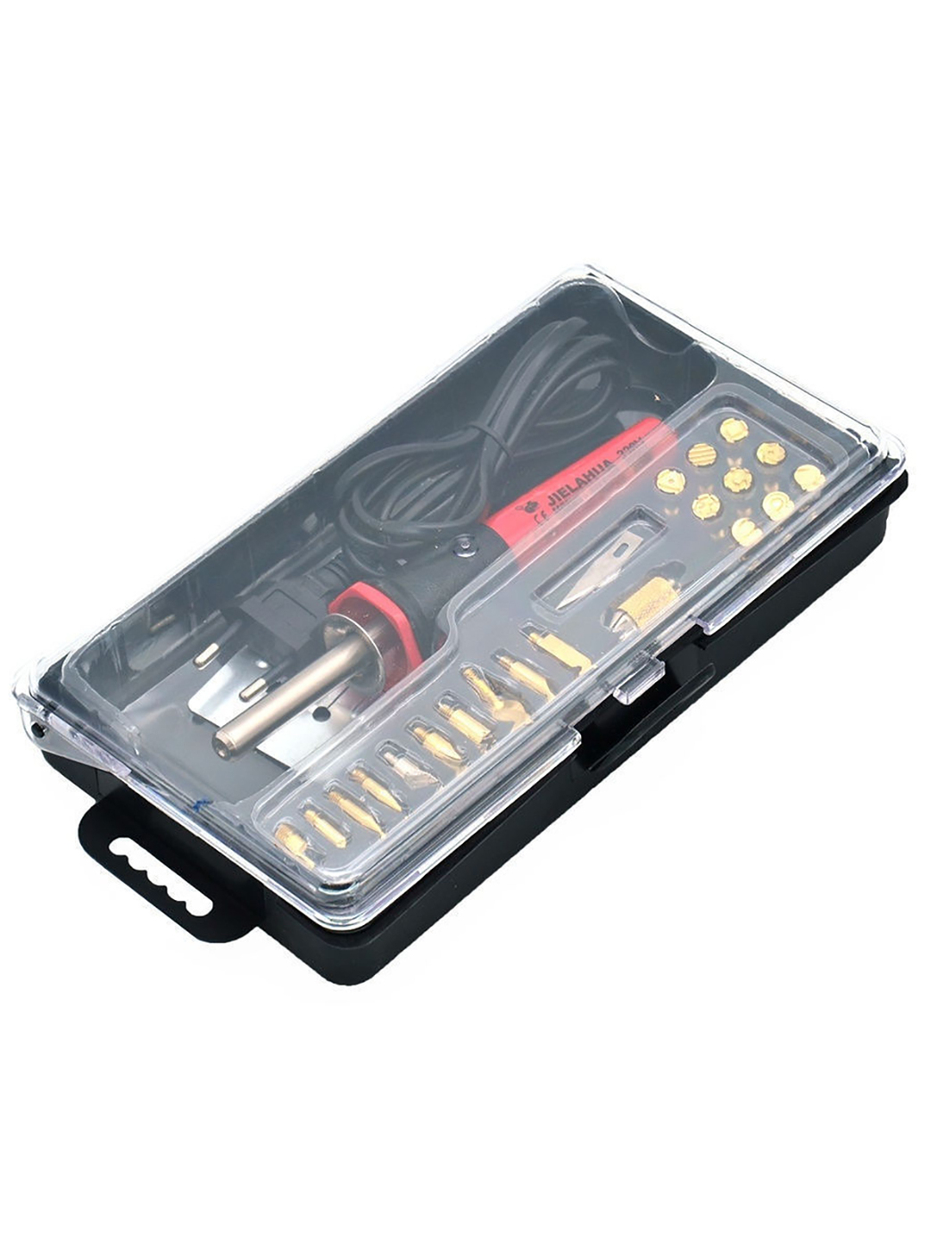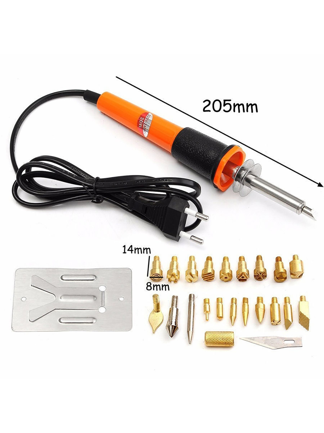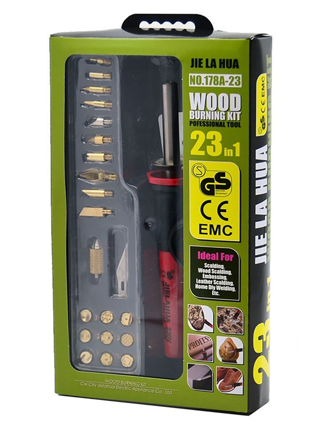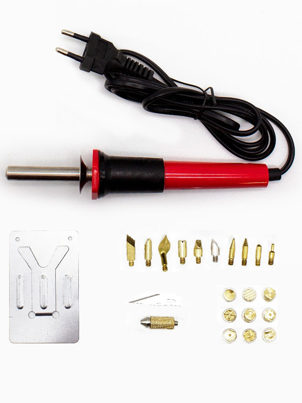 Выжигание это процесс нанесения различных рисунков на деревянную пластину, с использованием раскаленных инструментов. В современном мире, для этого процесса используются аппараты для выжигания. Набор укомплектован различными насадками (21 штука), которые