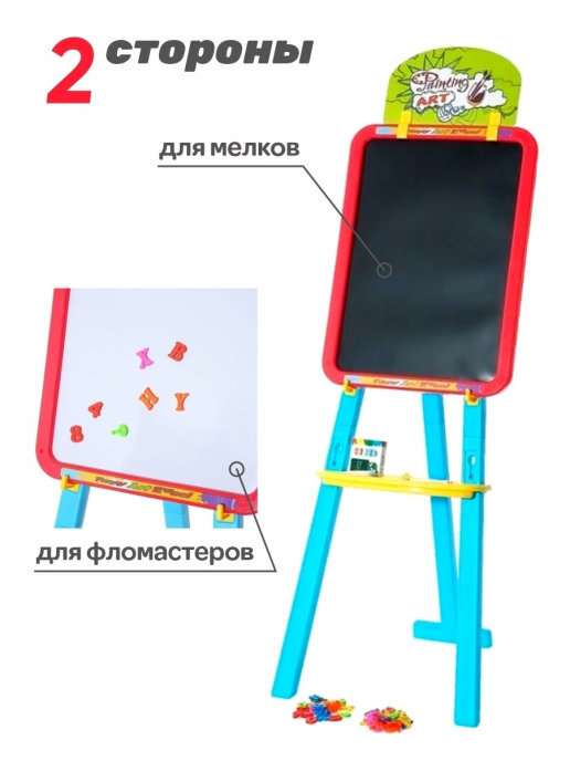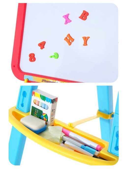 Размер доски 99х37,5см. Рабочая поверхность 43,5х31. В комплекте идут; 12 мелков, 4 фломастера (салатовый, красный, черный и желтый) с колпачками которые могут стирать надписи с доски, а также буквы на магнитиках, из которых на доске можно составлять слов