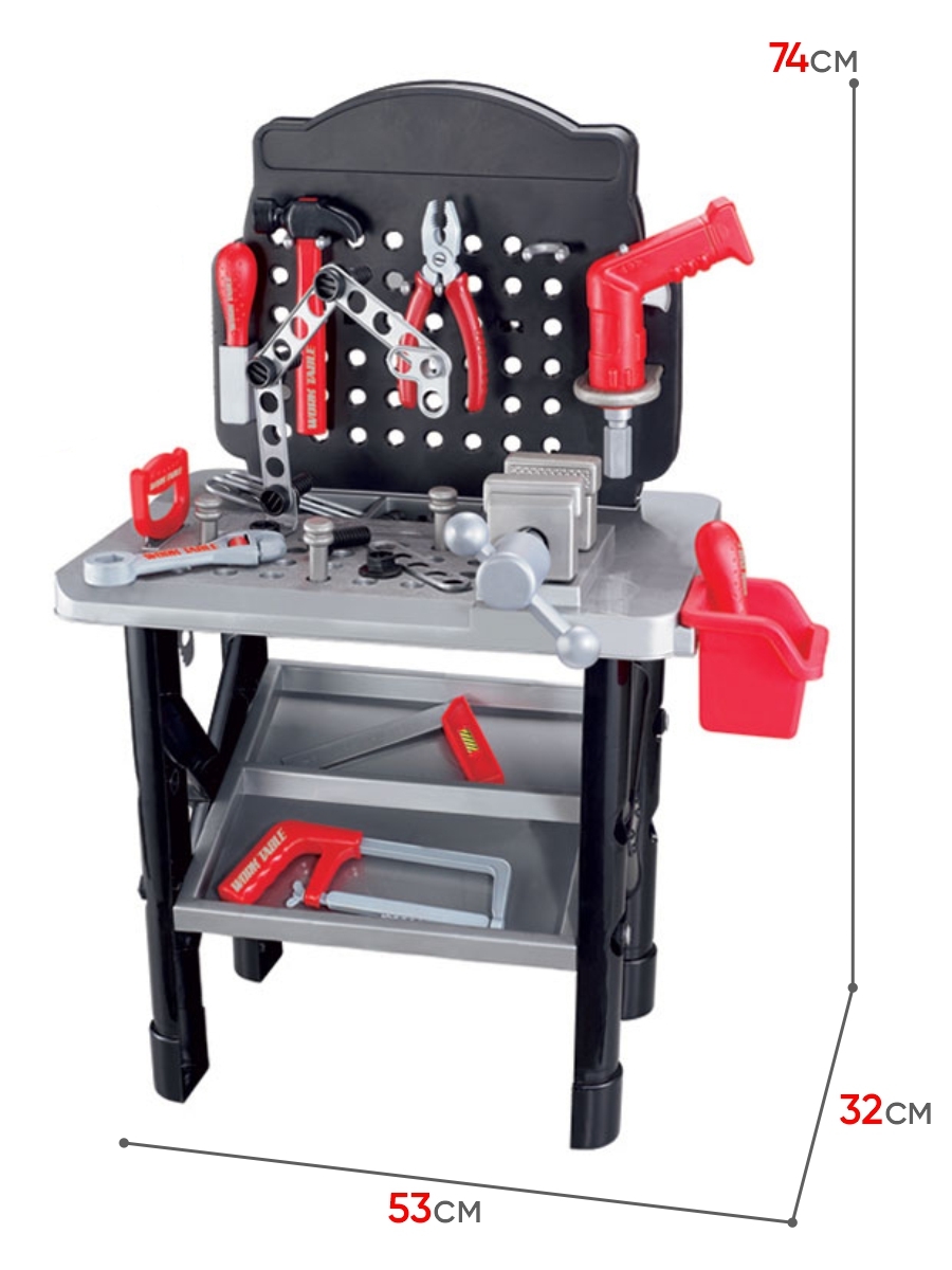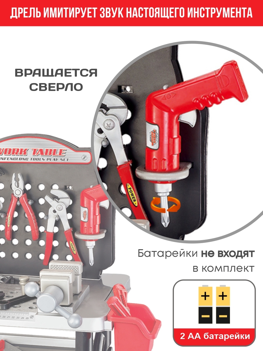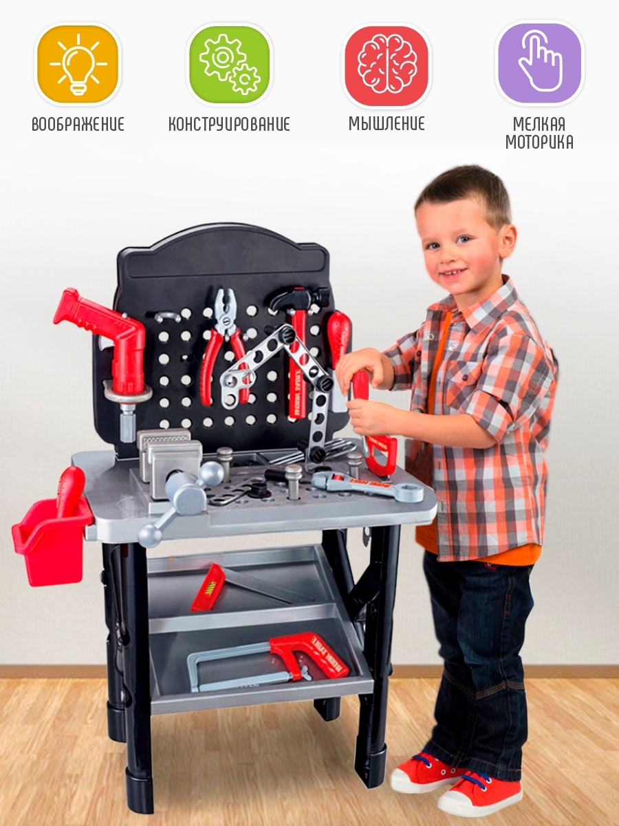 Игровой набор инструментов поможет вашему малышу скорее научиться помогать папе или дедушке. Этот набор превосходно подходит для маленького мастера и игры в мастерскую. В набор входит дрель с батарейным питанием. Все инструменты выглядит и функционируют к