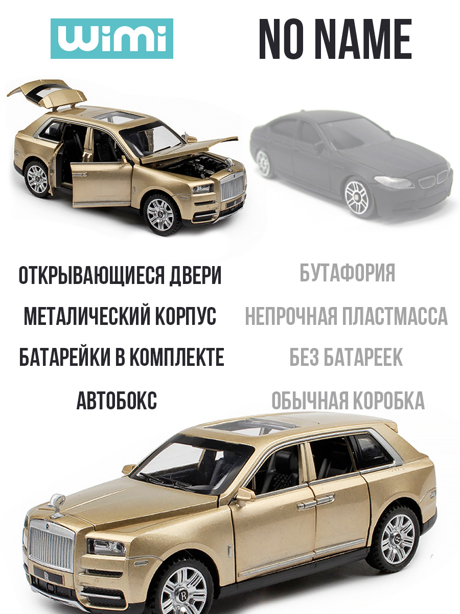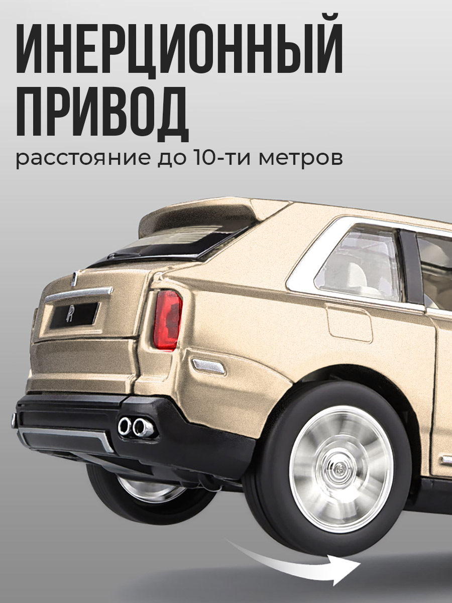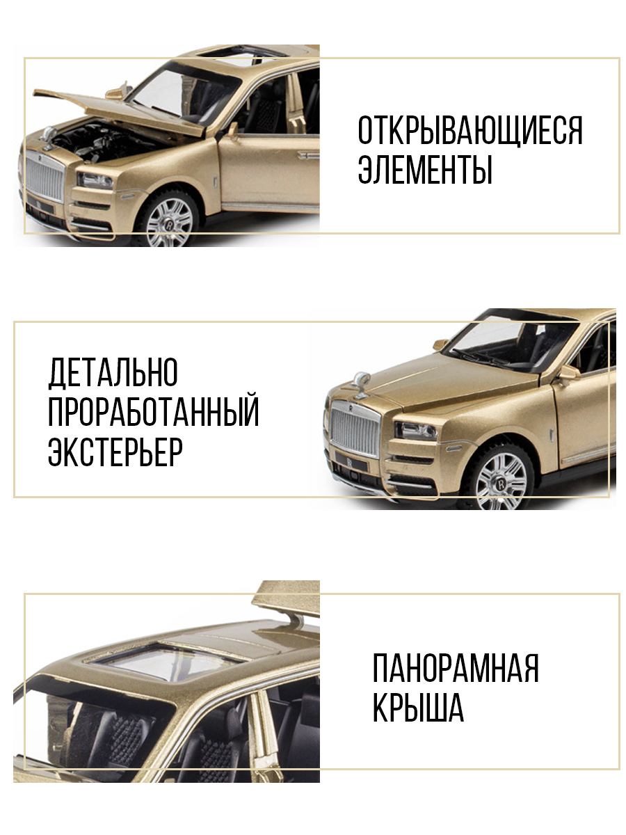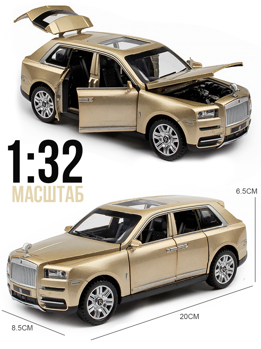 Коллекционная машинка Rolls Royce Cullinan отлично дополнит вашу коллекцию. Модель изготовлена в масштабе 1:32 и точно детализирована. Как и в оригинальном Rolls Royce, статуэтка традиционно украшает капот машины. В интерактивной машинке открываются все д