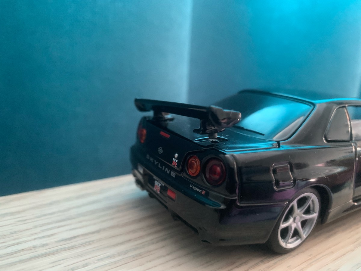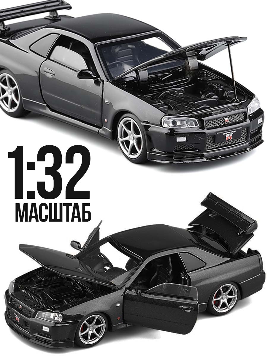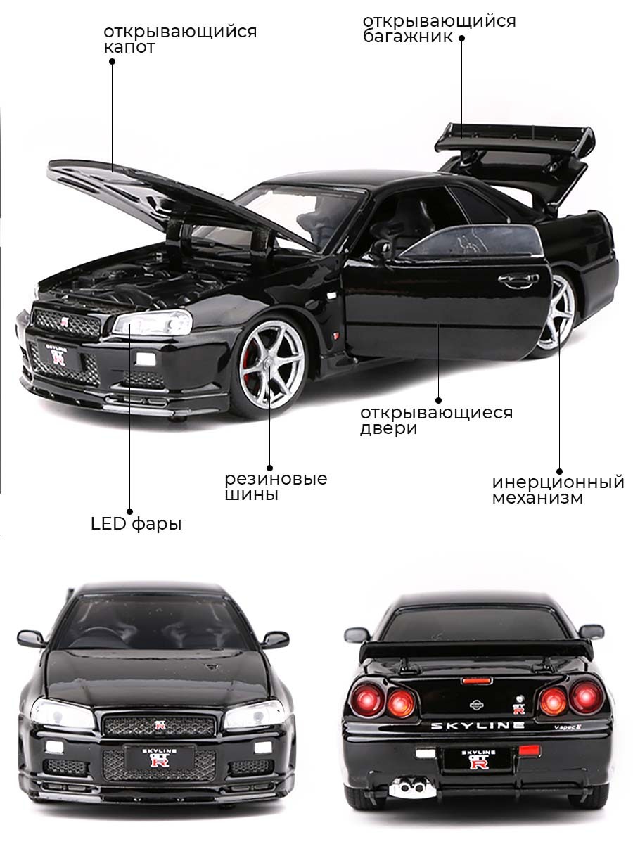 Коллекционная машинка Nissan Skyline GTR отлично дополнит вашу коллекцию. Модель изготовлена в масштабе 1:32 и точно детализирована. Высококачественный сплав металлов, резина и пластик придают модели дорогой и благородный вид. В интерактивной машинке откр