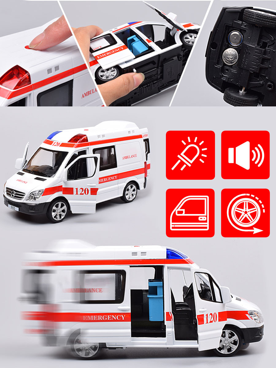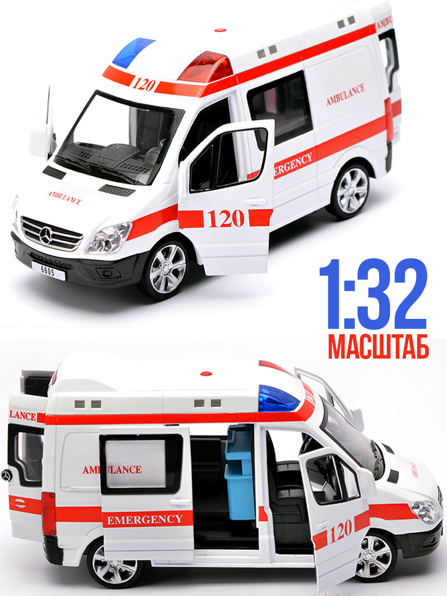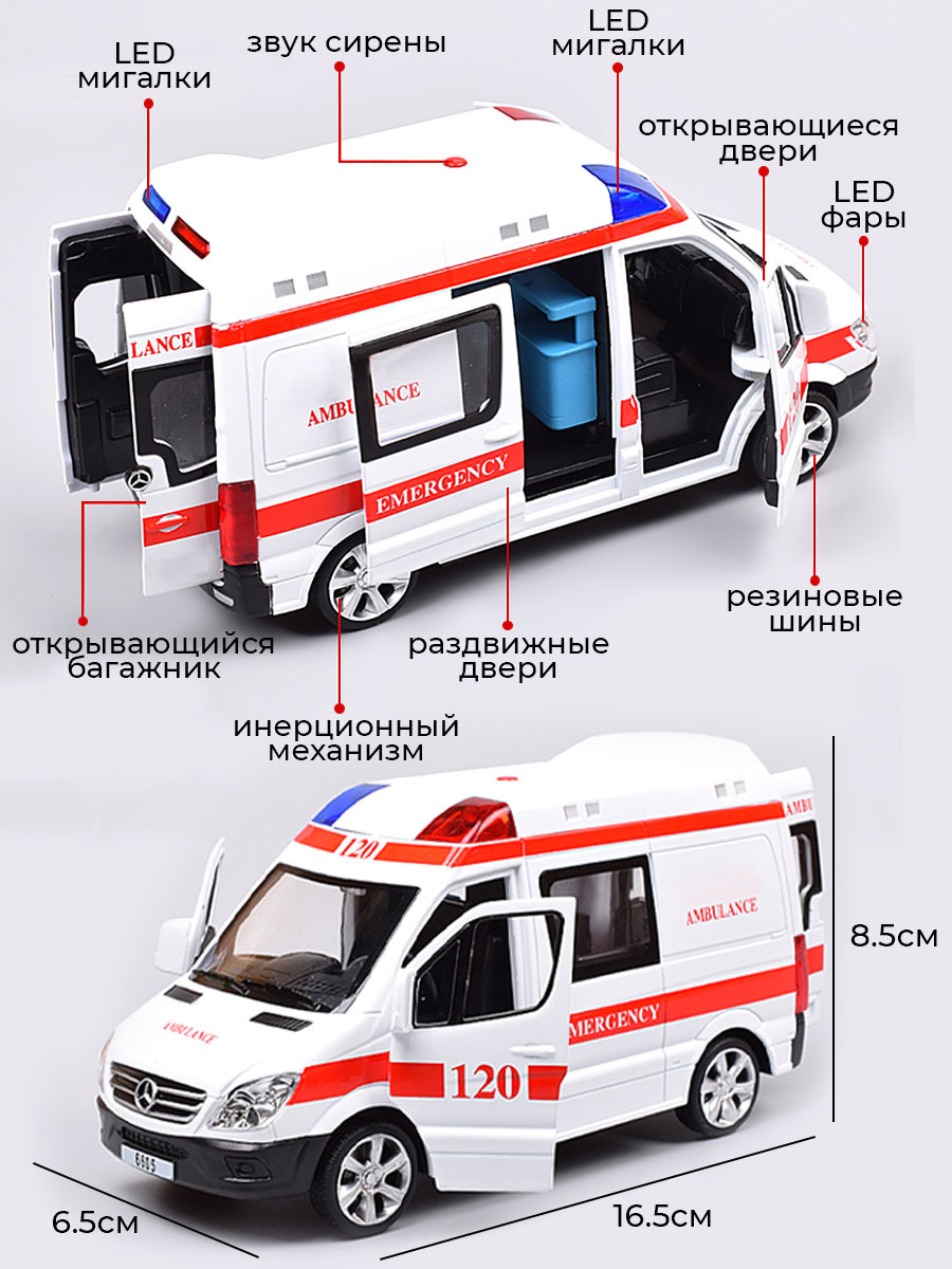 Машина скорой помощи отлично дополнит вашу коллекцию. Модель изготовлена в масштабе 1:32 и точно детализирована. Высококачественный сплав металлов, резина и пластик придают модели дорогой и благородный вид. В интерактивной машинке открываются двери, крутя