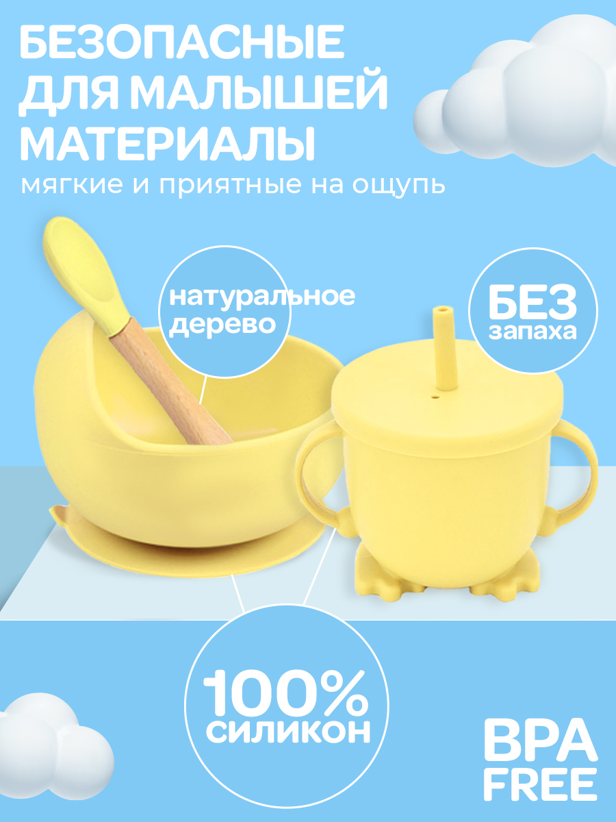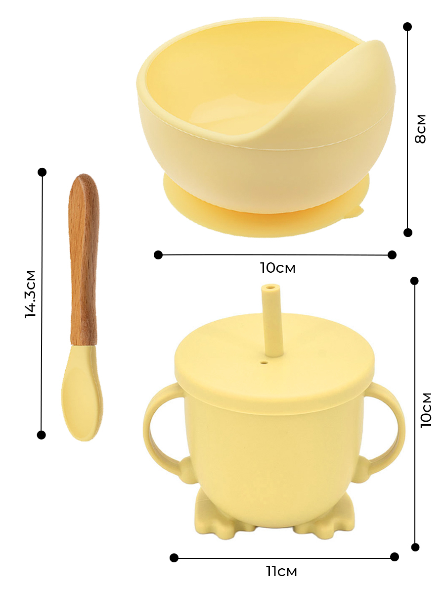 Силиконовая посуда для малышей набор выполнен из 100% безопасного силикона и предназначен для малышей от 6 месяцев. Набор включает чашку-непроливайку / поильник (150 мл) с мерной шкалой и съемную крышку со встроенной трубочкой, ложечку для кормления с дер