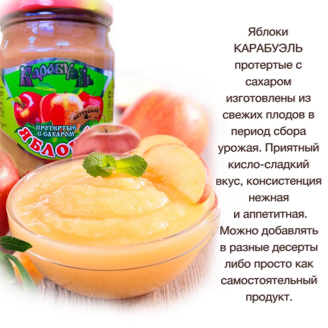 Условия хранения:При температуре от 0 до +25 и относительной влажности воздуха не более 75%Состав:Пюре яблочное, сахар Описание:Яблоки КАРАБУЭЛЬ протертые с сахаром изготовлены из свежих плодов в период сбора урожая по ГОСТ 22371-77. Приятный кисло-