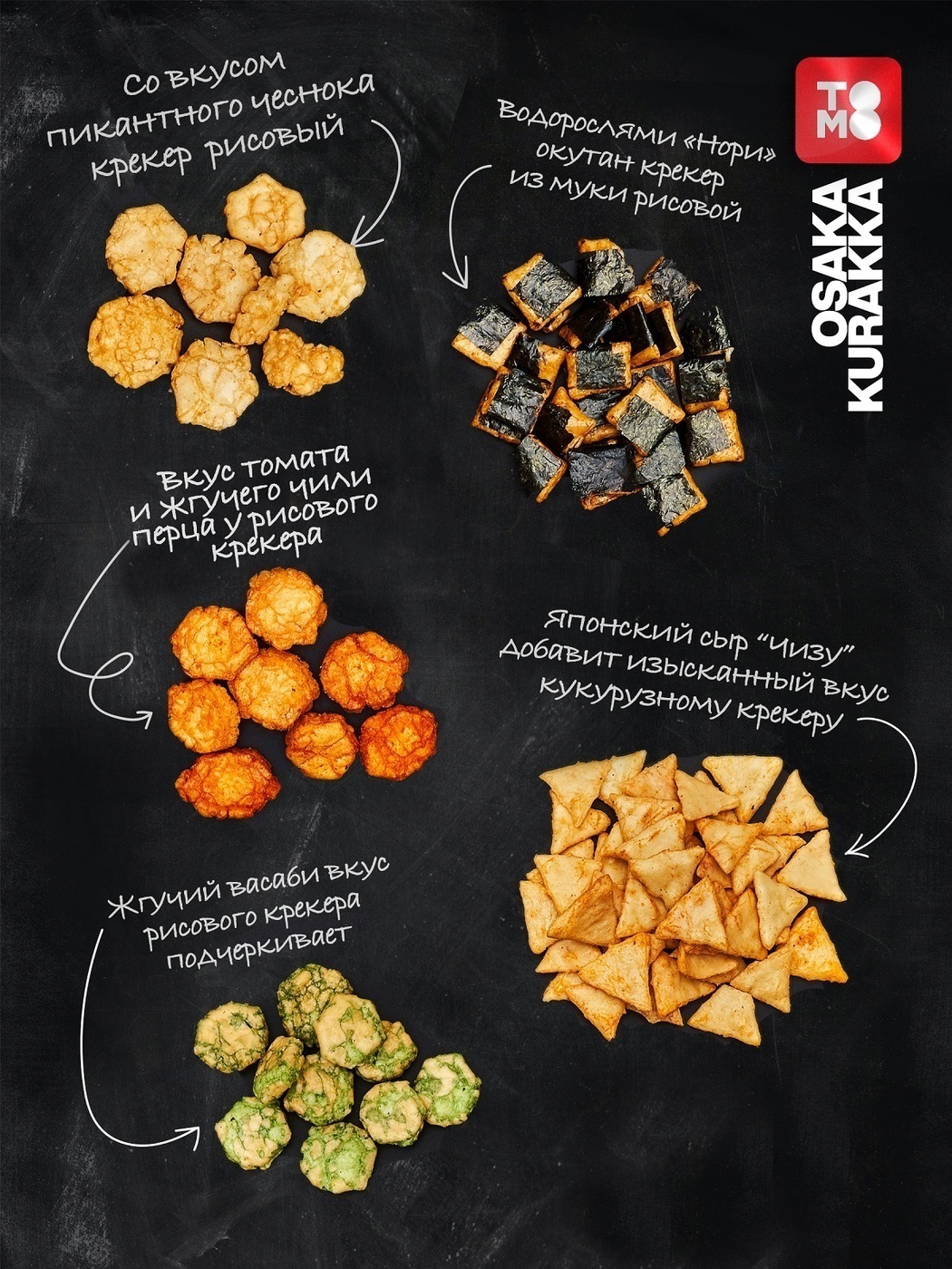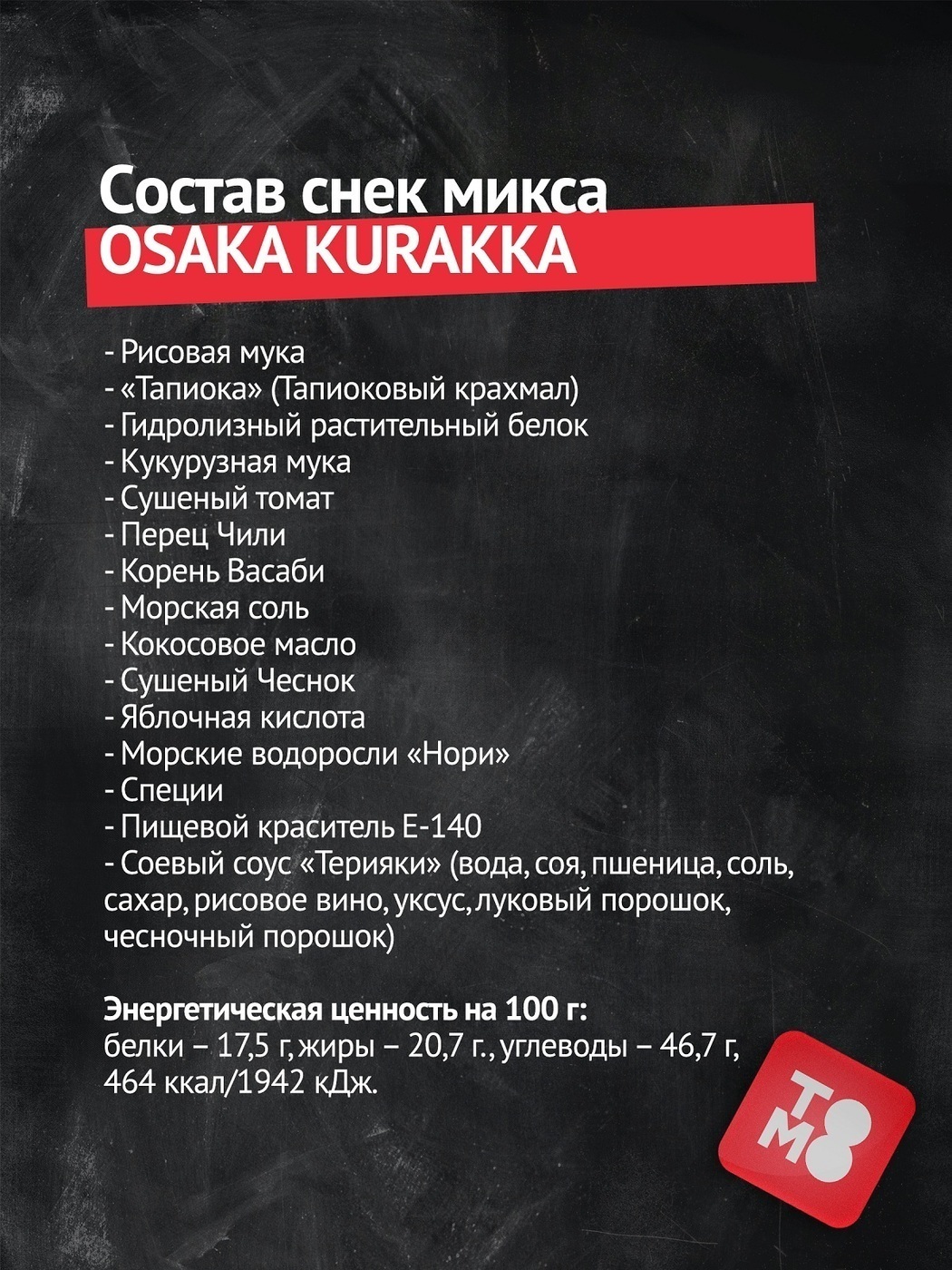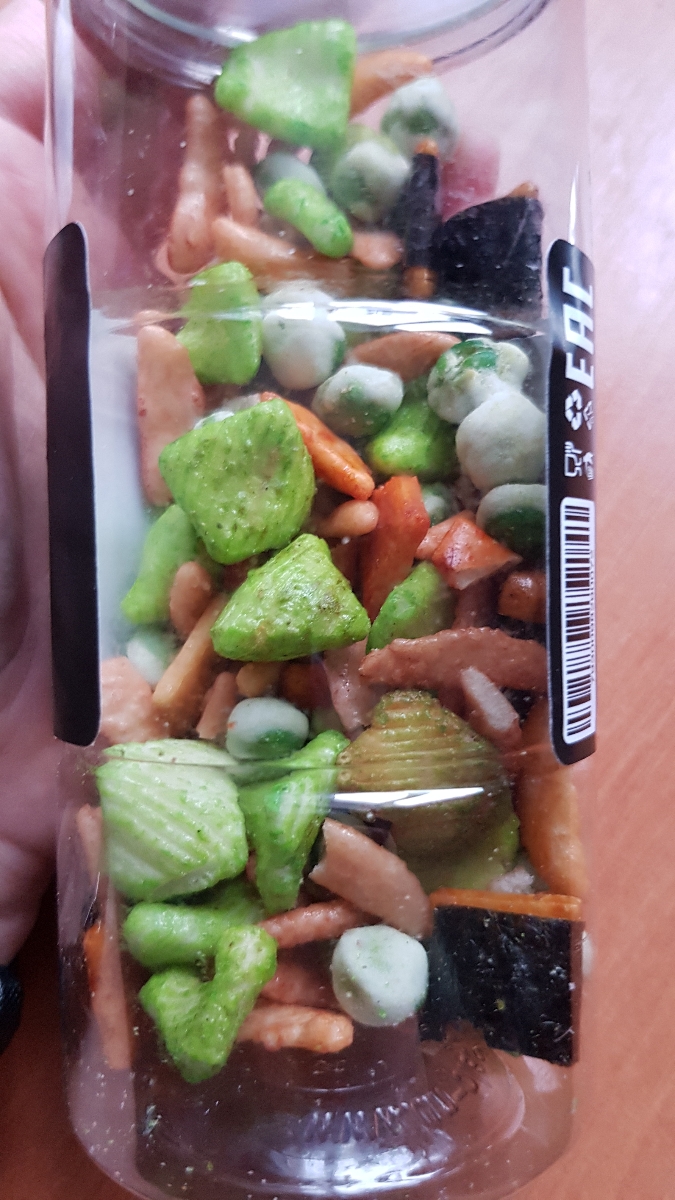 Состав средства:Рисовая мука, «Тапиока» (Тапиоковый крахмал), гидролизный растительный белок, кукурузная мука,корень Васаби, сушеный Томат, перец Чили, сушеный Чеснок, Морская соль, Кокосовое масло, Яблочнаякислота, морские водоросли «Нори», специи, пищев