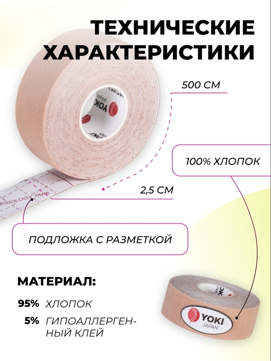 Высококачественный кинезио тейп YOKI - это эластичная лента из натурального хлопка.Состав:95% хлопок, 5% спандексСпособ применения:Очистите кожу, без натяжения наклейте ленту. Для удаления используйте косметическое масло или смочите тейп. После удаления т