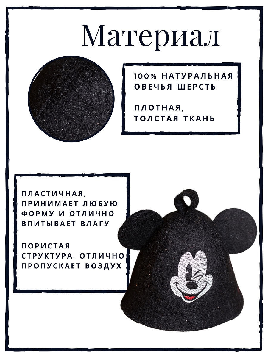 Комплектация:Шапка для бани и сауны 1 штОписание:Шапка для бани "Микки Маус", серия семейная. Поднимет настроение Вам и Вашей семье. Размер универсальный и подходит всем. Головной убор изготовлен из премиальной натуральной овечьей шерсти. Используется в с