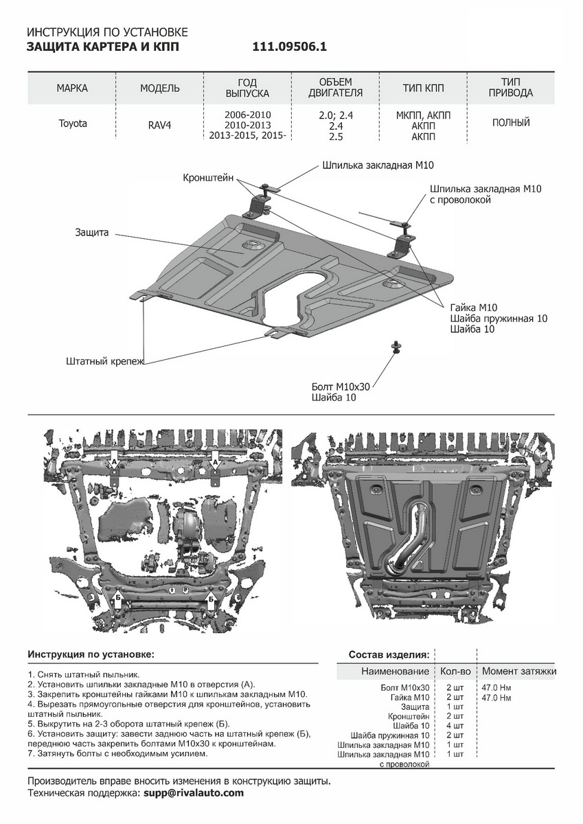 Защита картера и КПП АвтоБроня подходит для:Toyota RAV4 XA30 (V - 2.0; 2.4) 2005-2010Toyota RAV4 XA30 рестайлинг (V - 2.4) АКПП 2010-2013Toyota RAV4 CA40 (V - 2.5) АКПП 2012-2019Защищаемый агрегат - картер, КПП.Наличие крепежа - в комплекте.Материал - ста