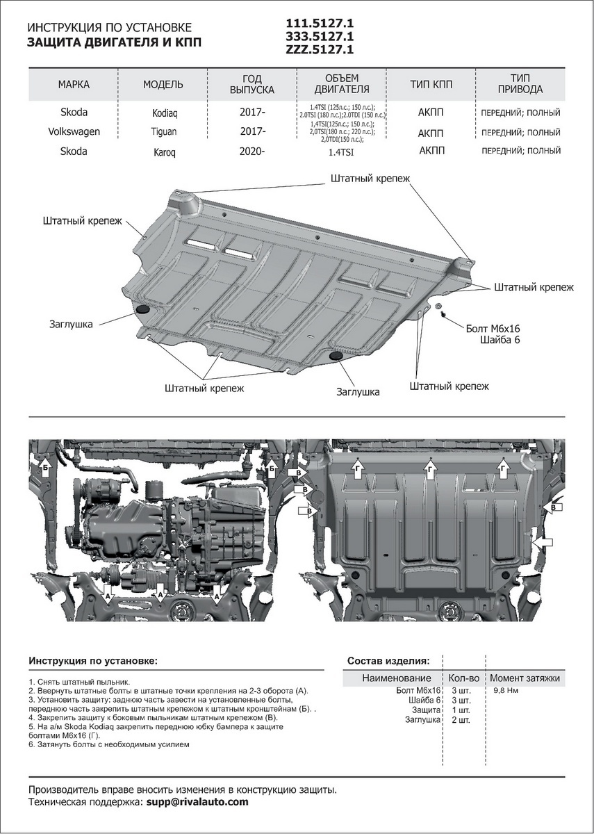 Комплектация:Защита - 1 шт., упаковка, крепеж, инструкцияОписание:Защита картера и КПП Rival подходит для:Skoda Karoq (V - 1.4 (150 л.с.)) 2020-н.в.Skoda Kodiaq (V - 1.4 (125/150 л.с.); 2.0 (180 л.с.)) 2017-н.в.Skoda Kodiaq (V - 2.0D (150 л.с.)) (с Webast