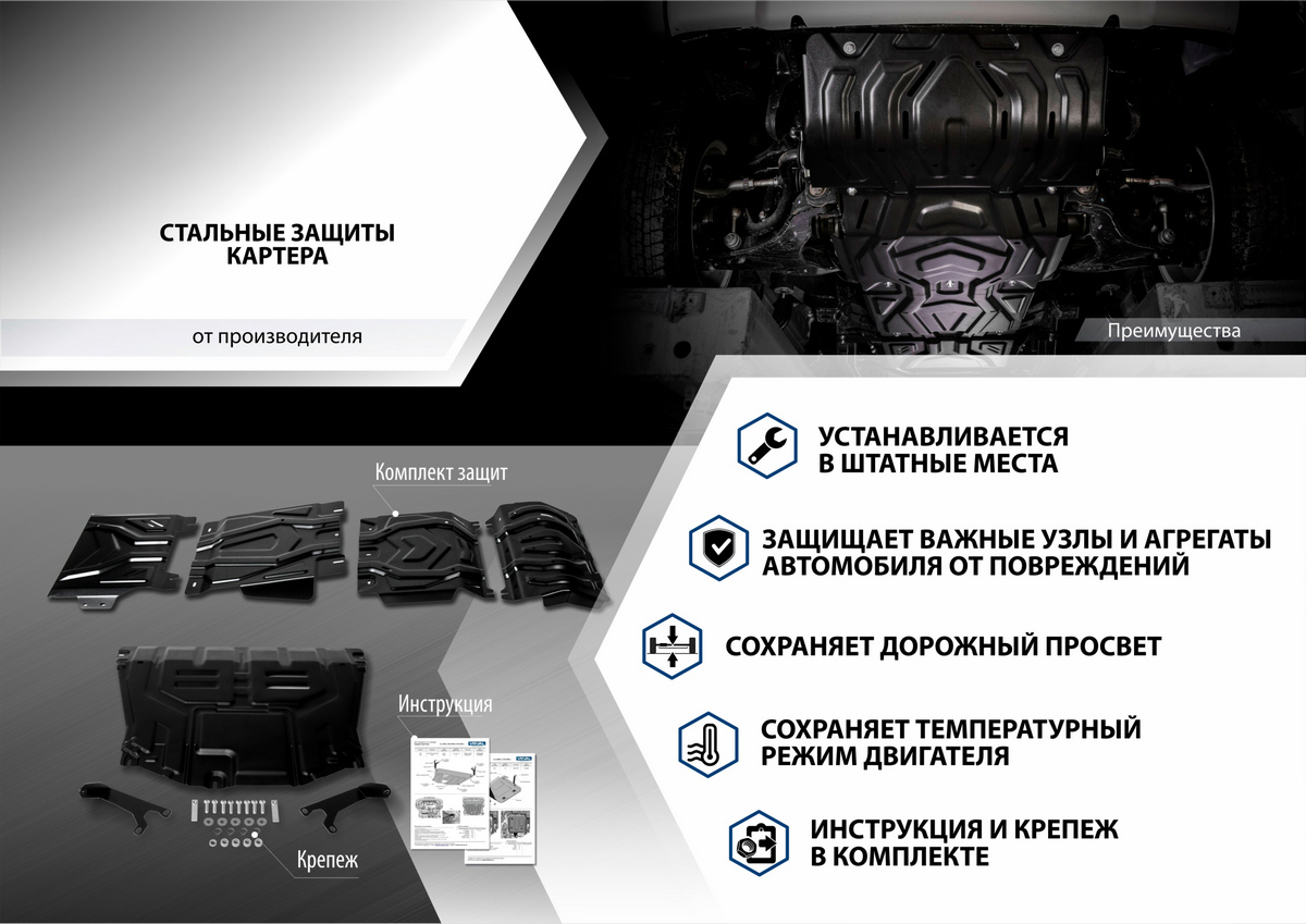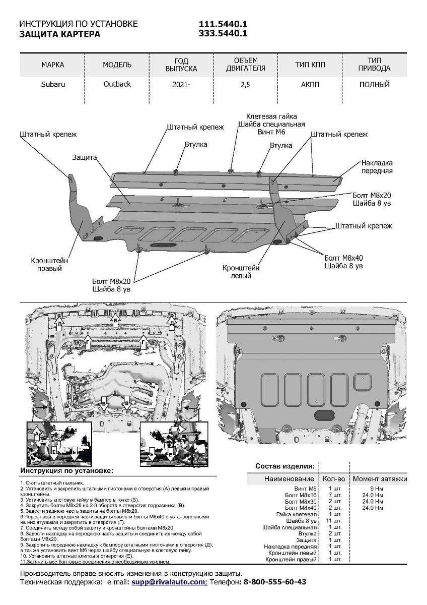 Комплектация:защита - 1 шт., упаковка, крепеж, инструкцияОписание:Защита картера Rival подходит для:Subaru Outback VI 2021-н.в.Защищаемый агрегат - картер.Наличие крепежа - в комплекте.Материал - сталь 1.8 мм.Цвет - черный.Упаковка - термоусадочная пленка