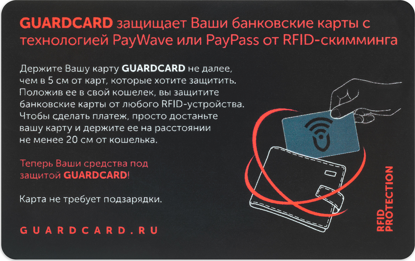Новая, специальная карта позволяет защитить одновременно все банковские карты, расположенные в Вашем портмоне. Она изменяет сигнал идущий от платежной карты и не позволяет мошенникам украсть данные карточки с целью последующего хищения с нее средств. Guar