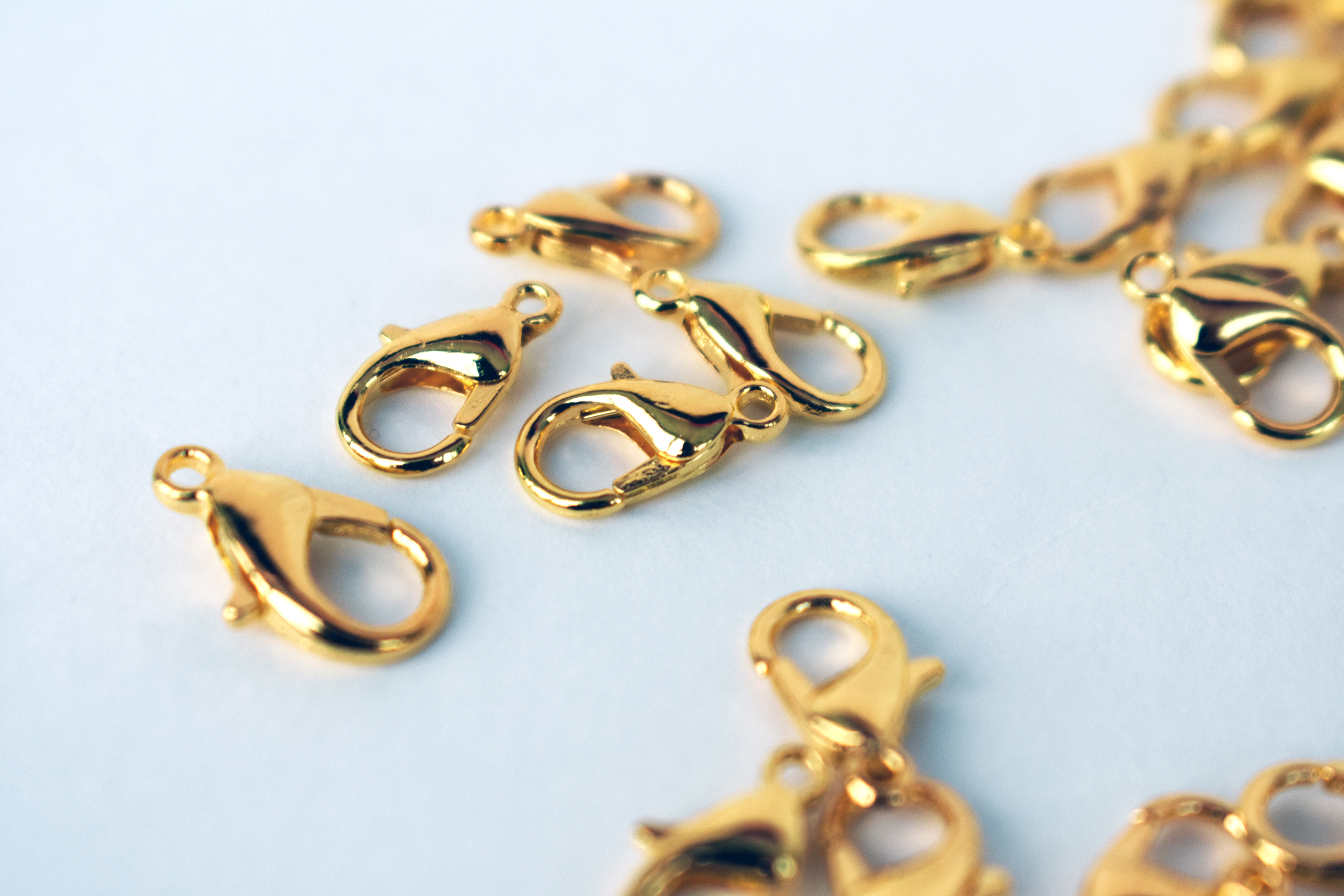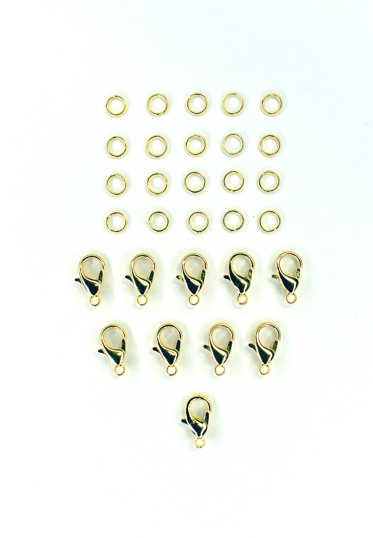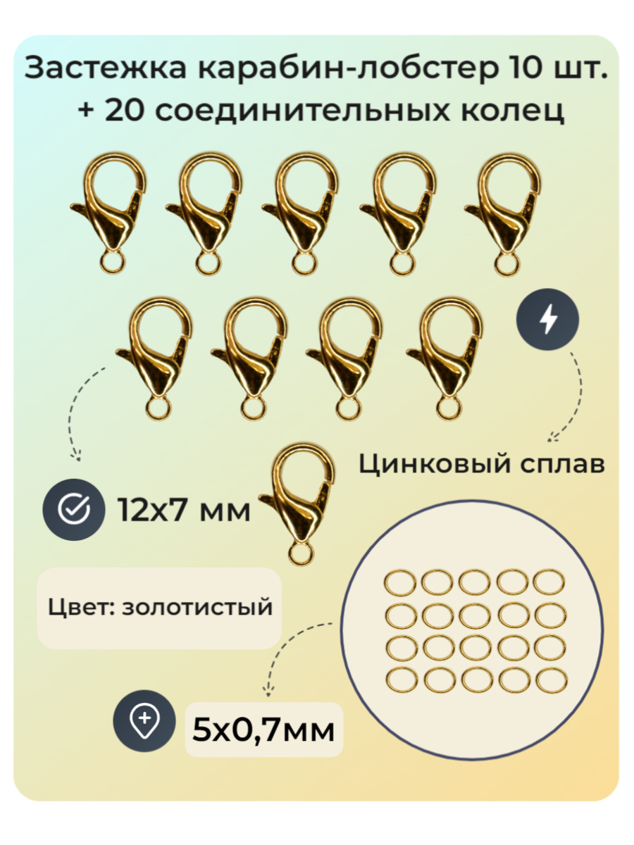 Набор состоит из застежек карабин-лобстер 12мм (10 штук) и соединительных колец 5*0,7мм (20 штук). Замочки для бижутерии двух цветов: золотистый, серебристо-белый; материал экологически чистый бижутерный (цинковый) сплав. Наиболее используемые в рукоделии