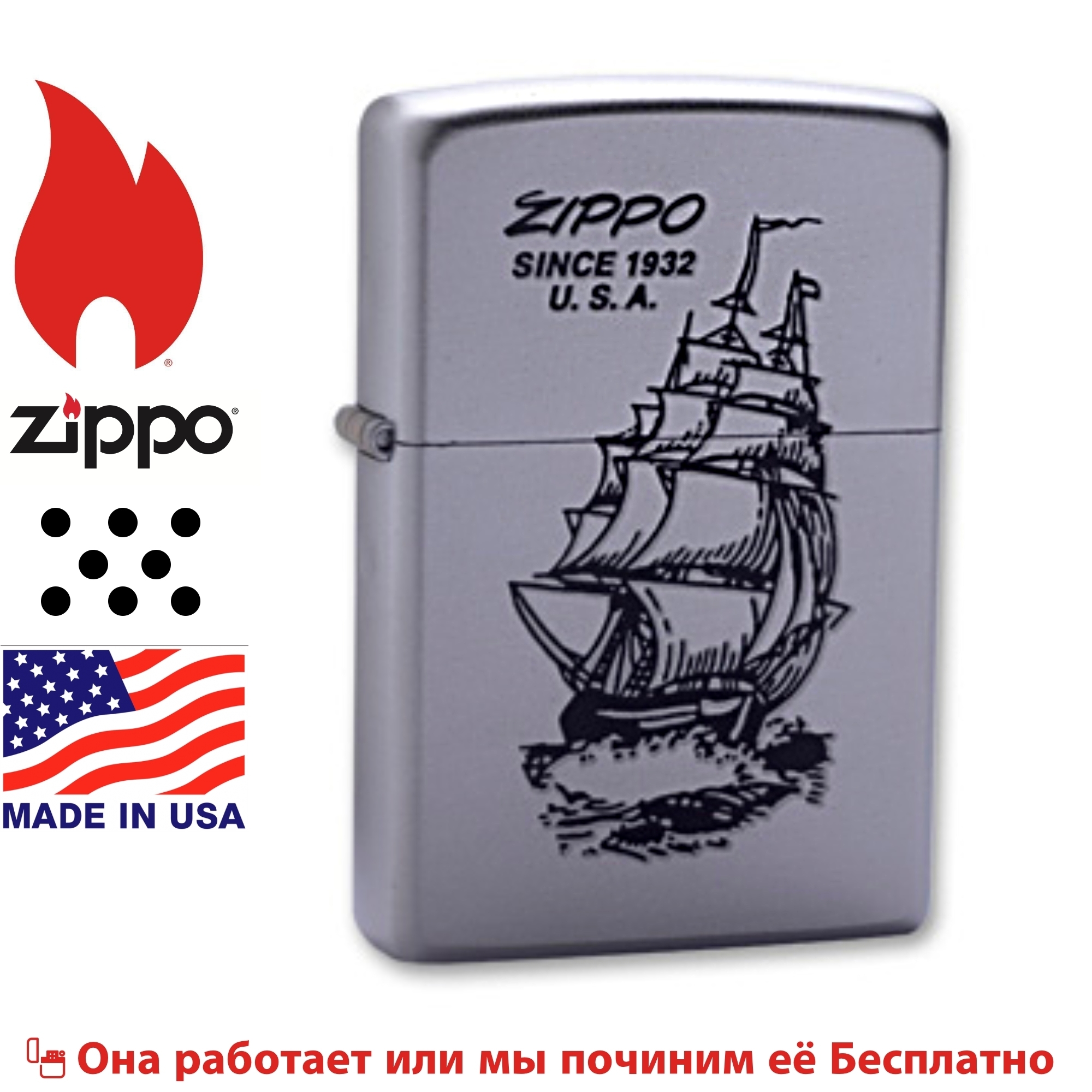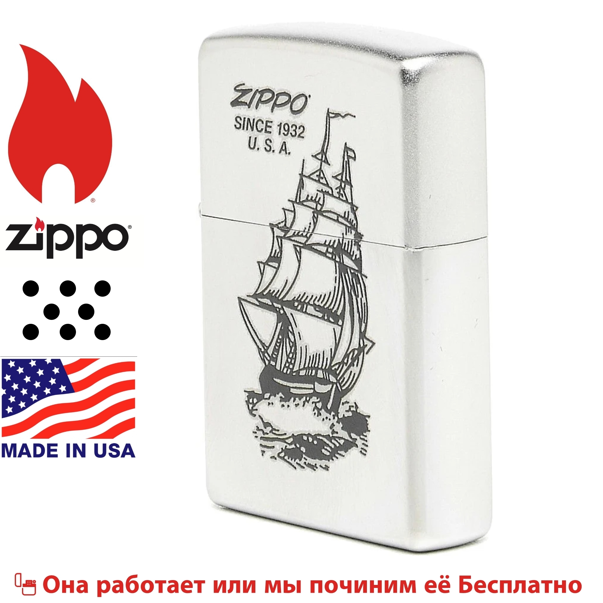 • Satin Chrome• Изображение корабля с надписью Zippo since 1932 U.S.A.• Пожизненная гарантия• Рекомендуем заправлять только первоклассным топливом Zippo