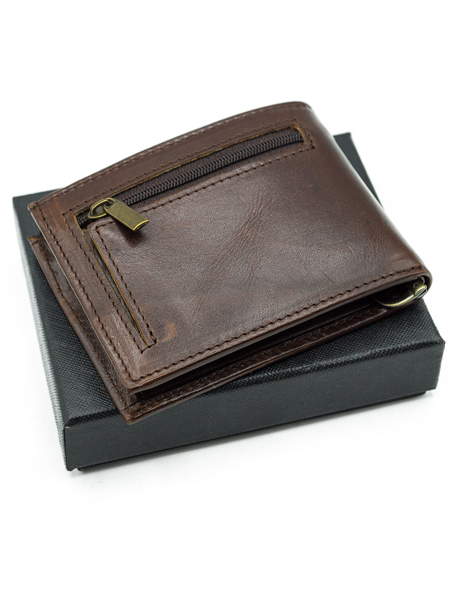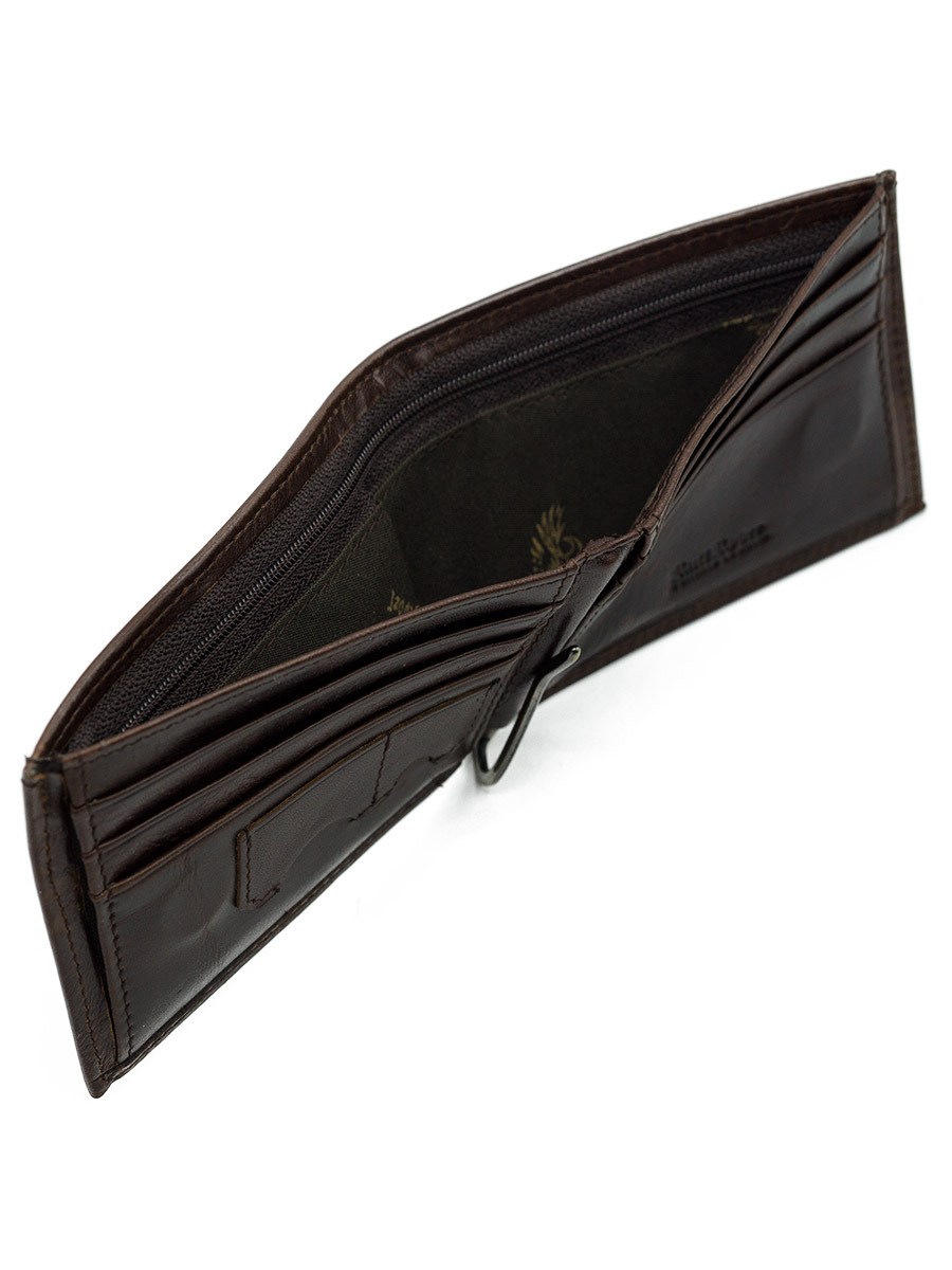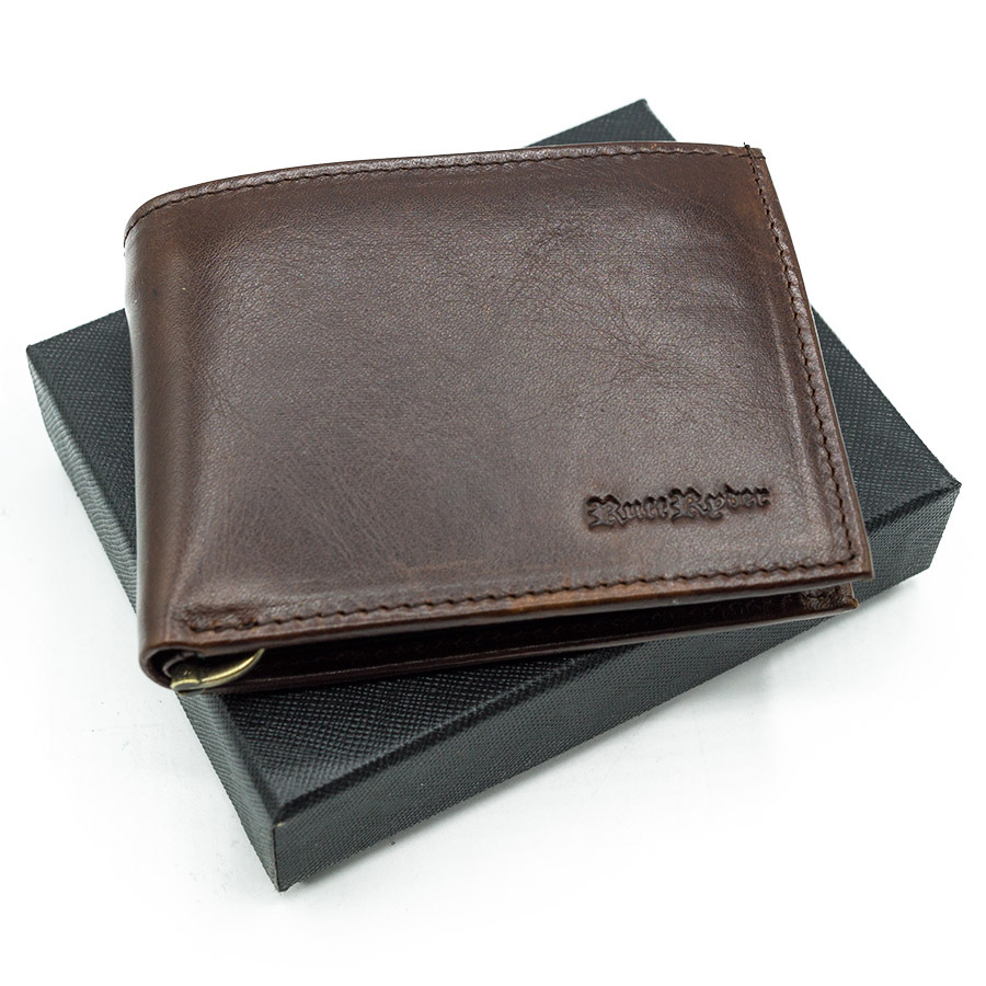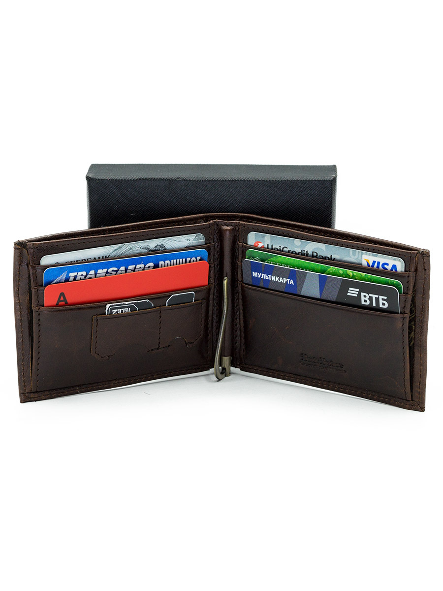 Зажим для денег Ruff Ryder шоколадного цвета изготовлен из натуральной кожи, имеет компактные размеры, его можно положить в карман и он не займет много места. Закрывается на два скрытых магнита, сверху имеет отделение для банкнот и крупное отделение на мо