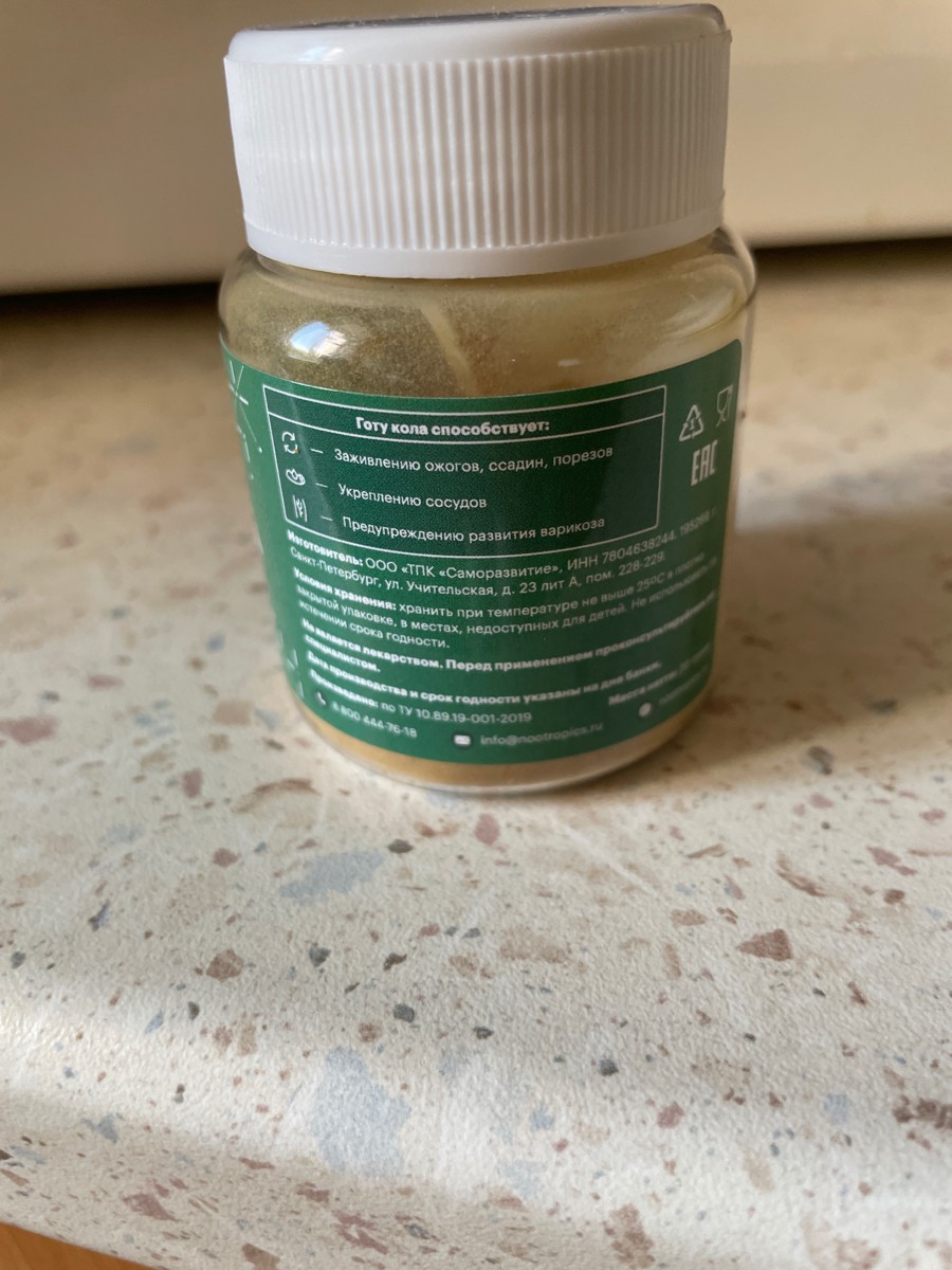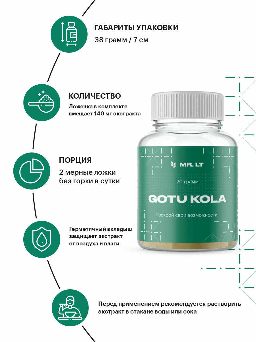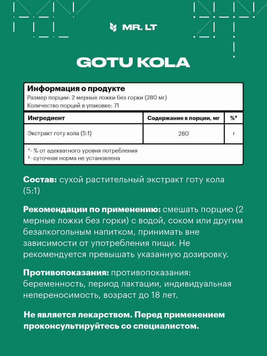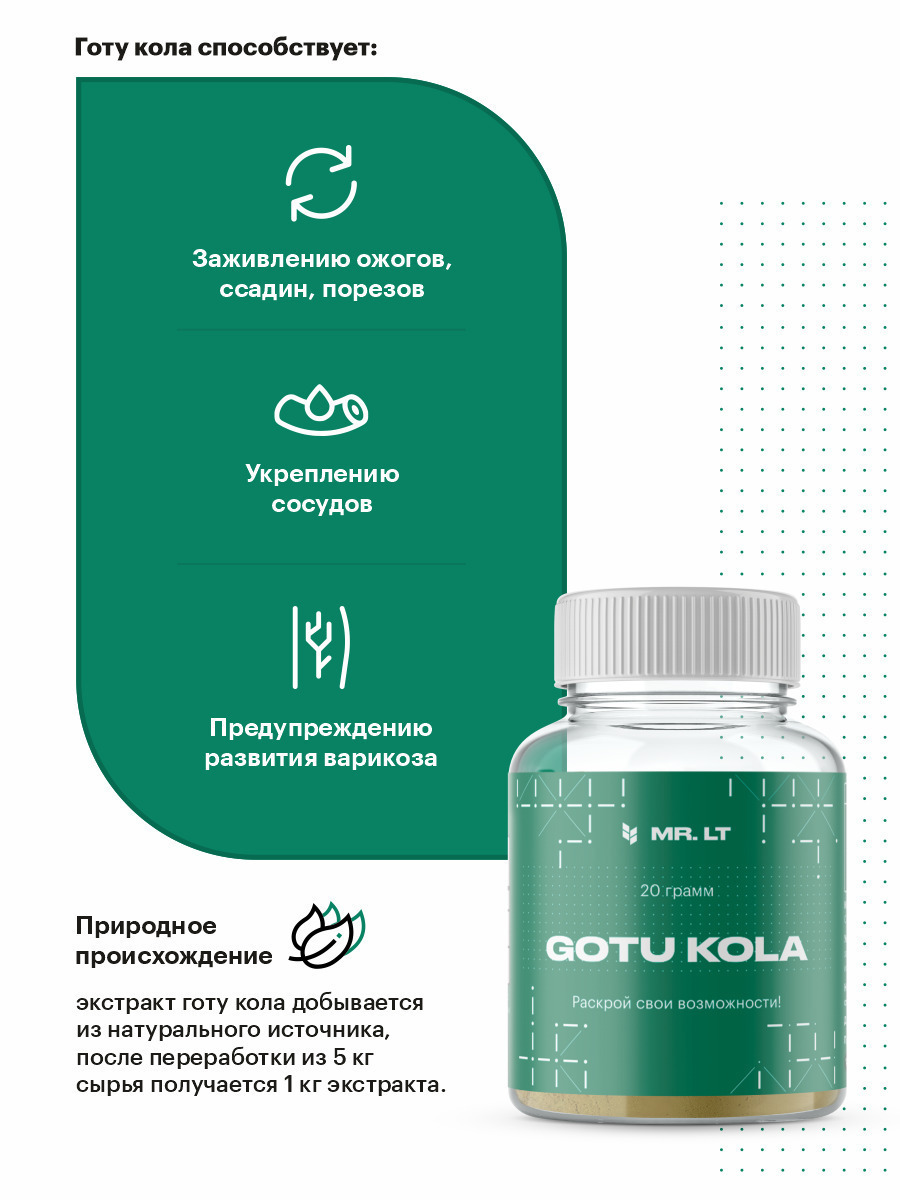 Состав средства:2 мерные ложки без горки (280 мг) содержат : экстракт готу кола (5:1) (280 мг)Описание:Естественная красота с GOTU KOLA!ЗДОРОВАЯ КОЖА – Экстракт готу кола содержит тритерпеноиды, которые способствуют улучшению качества кожи и ногтевых плас