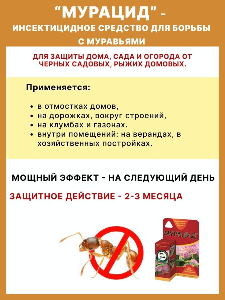Универсальный препарат от муравьев Мурацид 10 мл применяется в виде раствора для полива муравейников и мест передвижения насекомых и в виде приманок в помещениях. Для уничтожения муравейников на участках, клумбах и газонах, внутри помещений. Гибель муравь