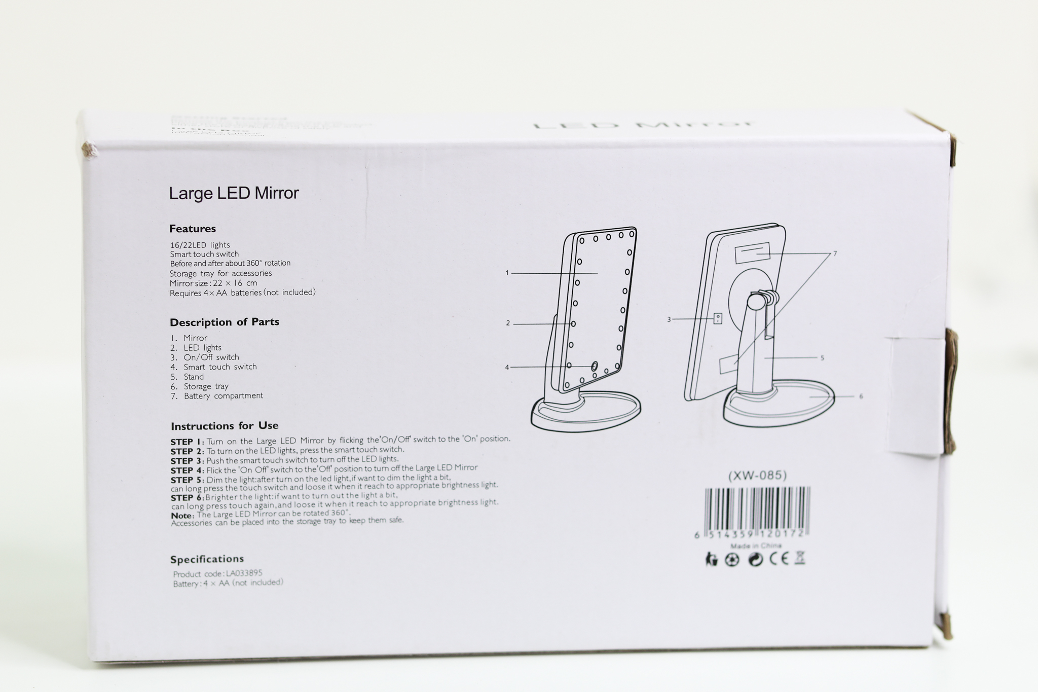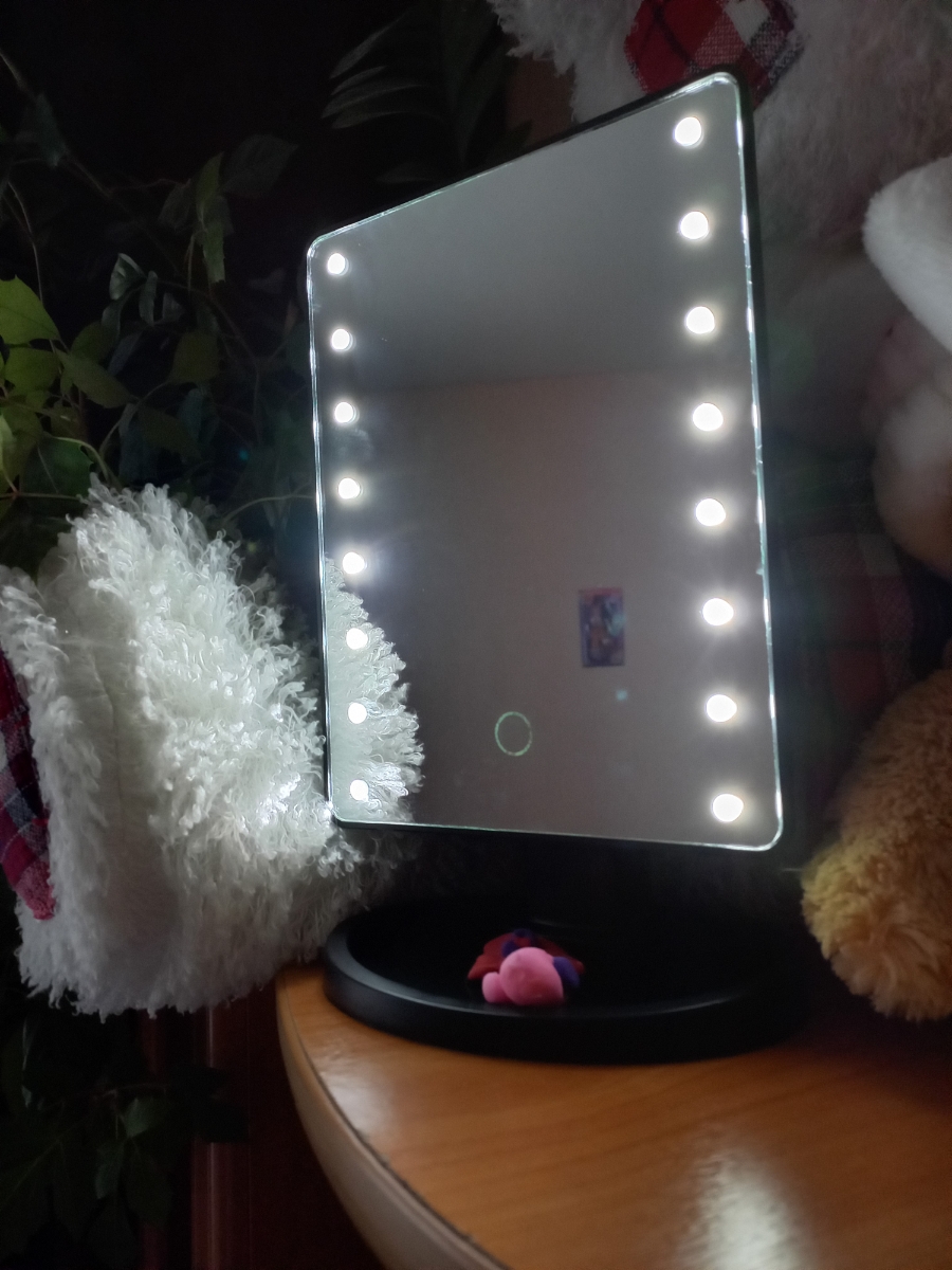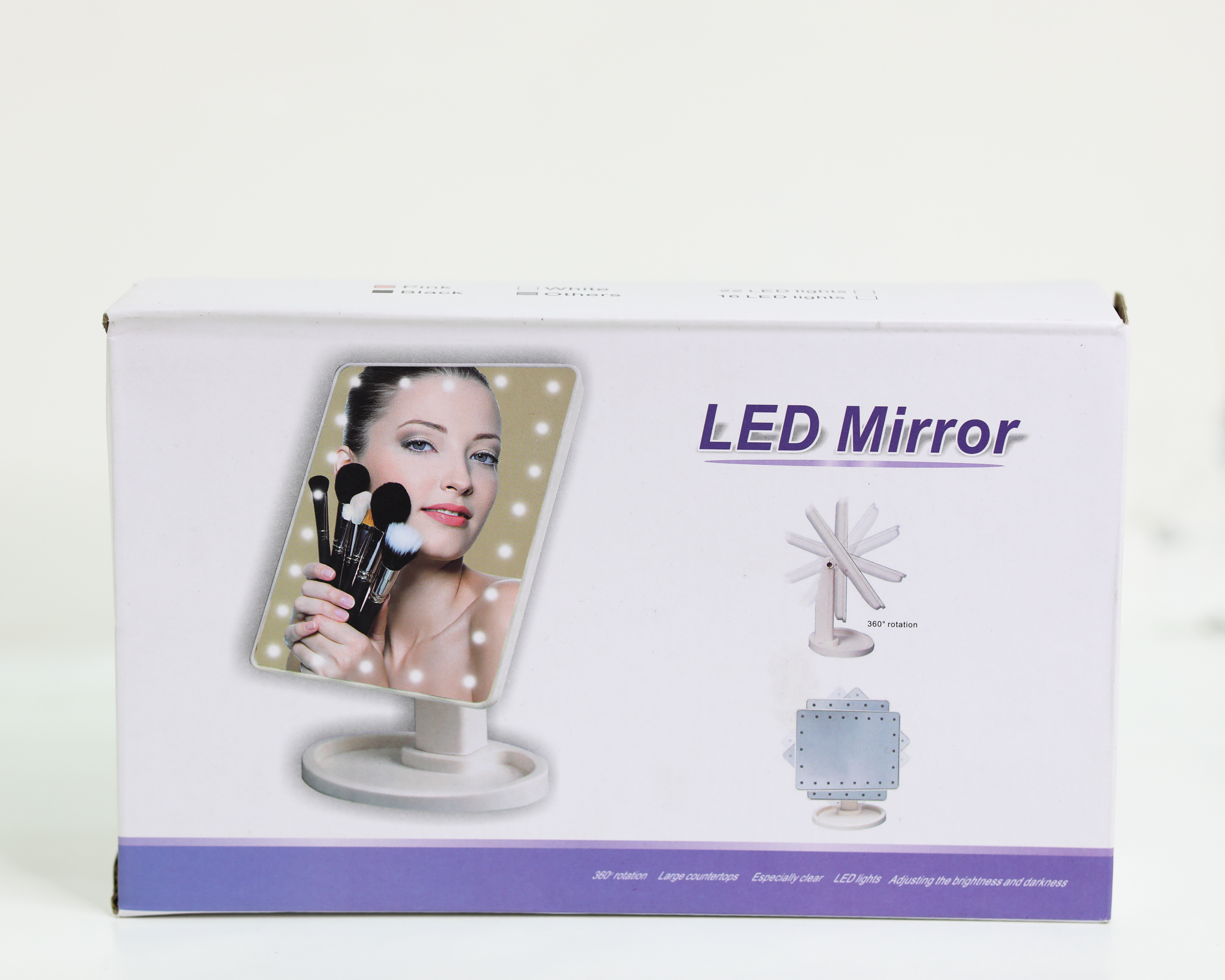 Комплектация:Зеркало;Подставка-держатель;Инструкция на английском языке;Картонная упаковка.Описание:Светодиоды по периферии равномерно освещают лицо (LED-подсветка), независимо от времени суток, что позволяет без ошибок наносить косметические средства. Вк