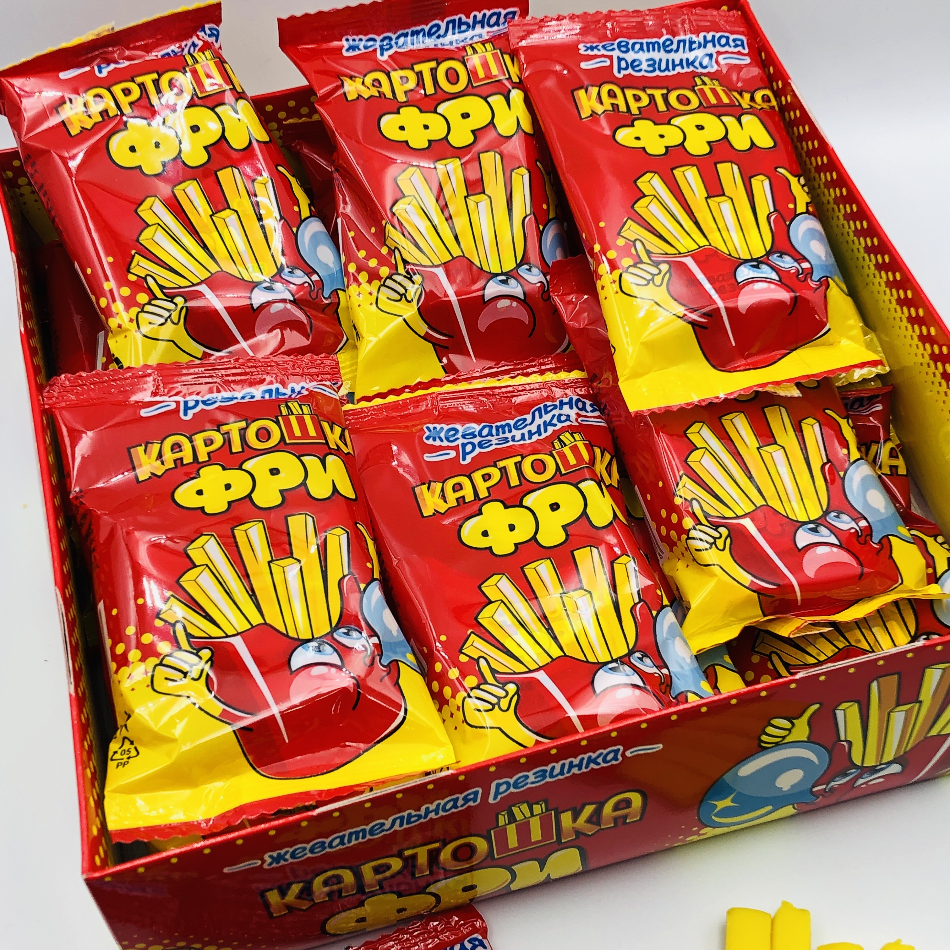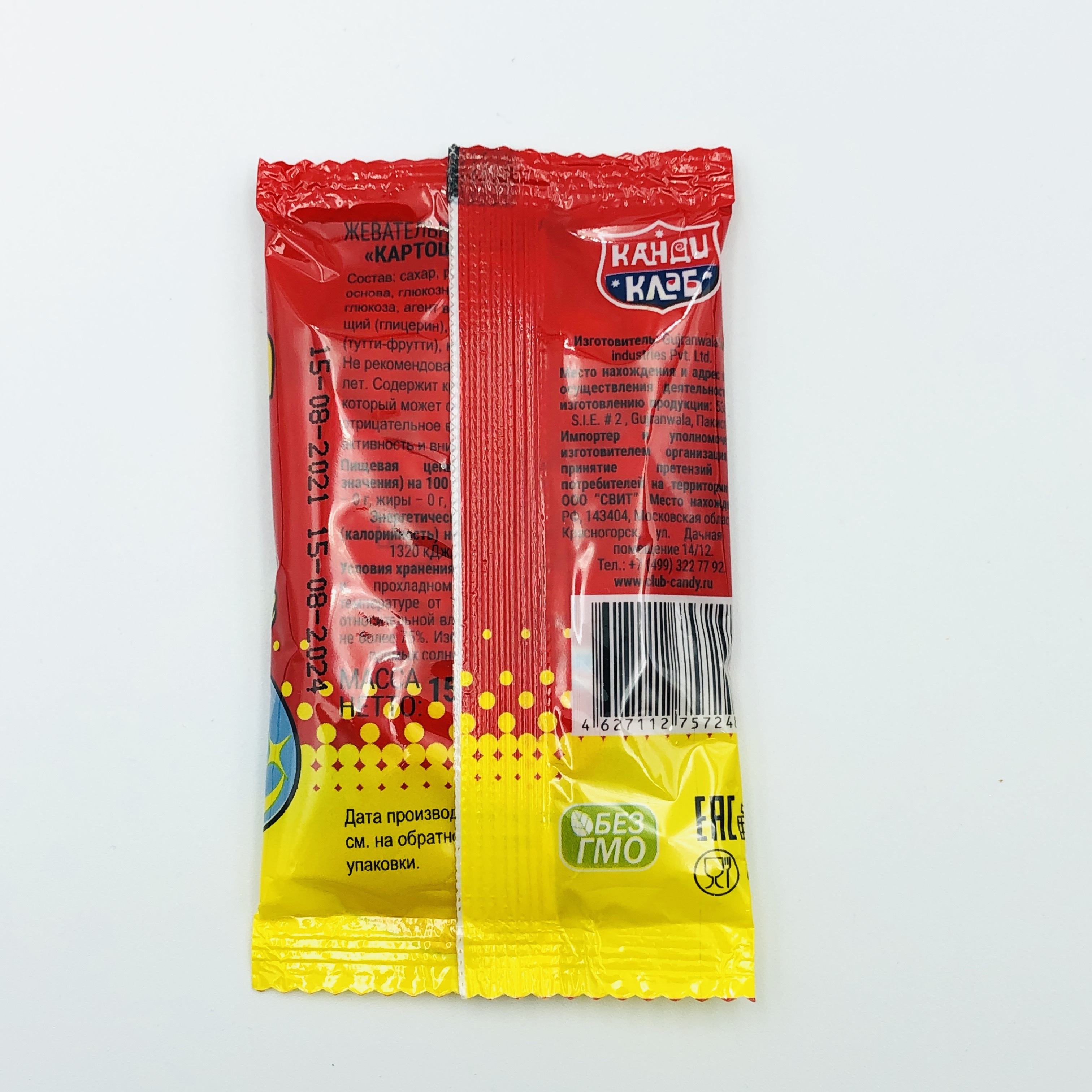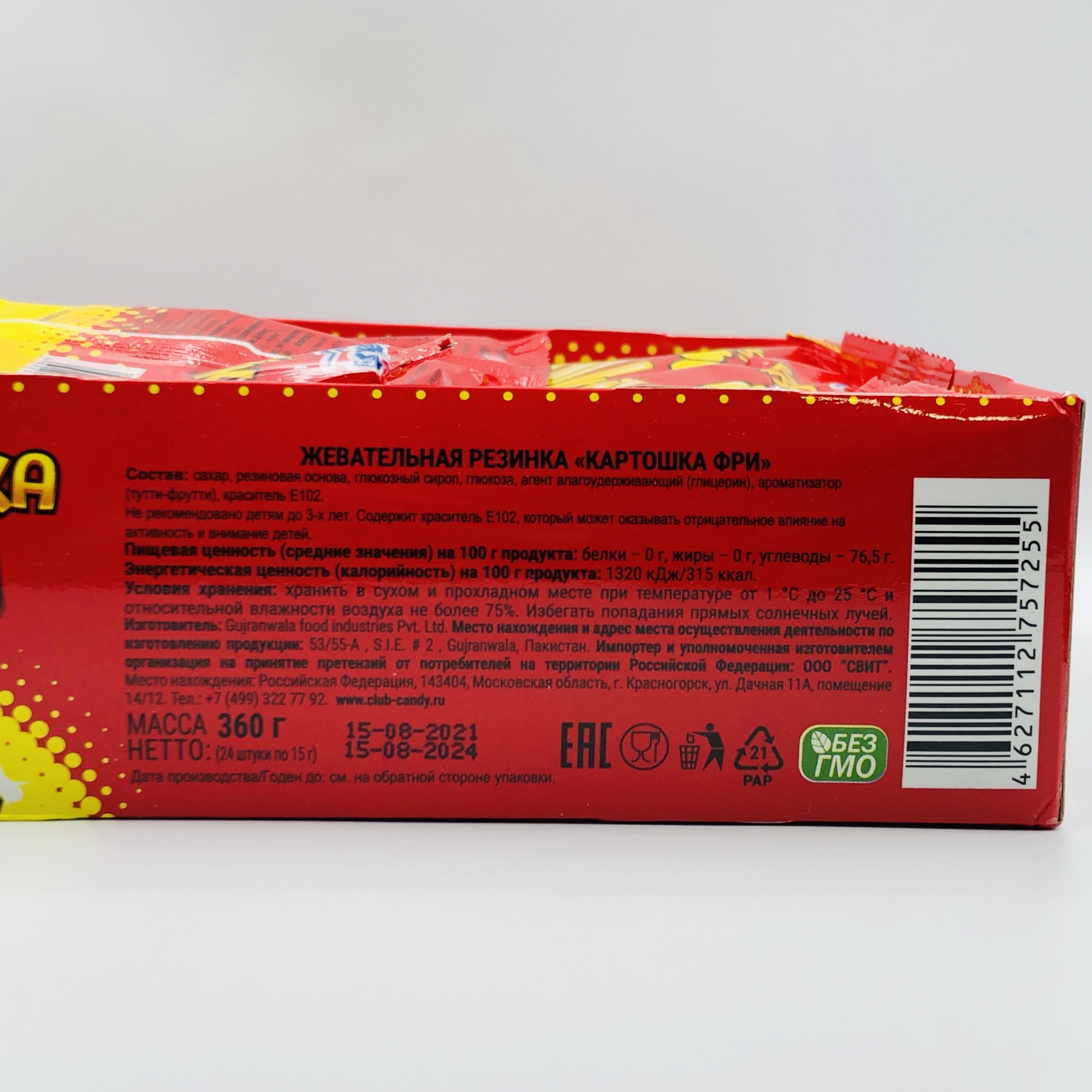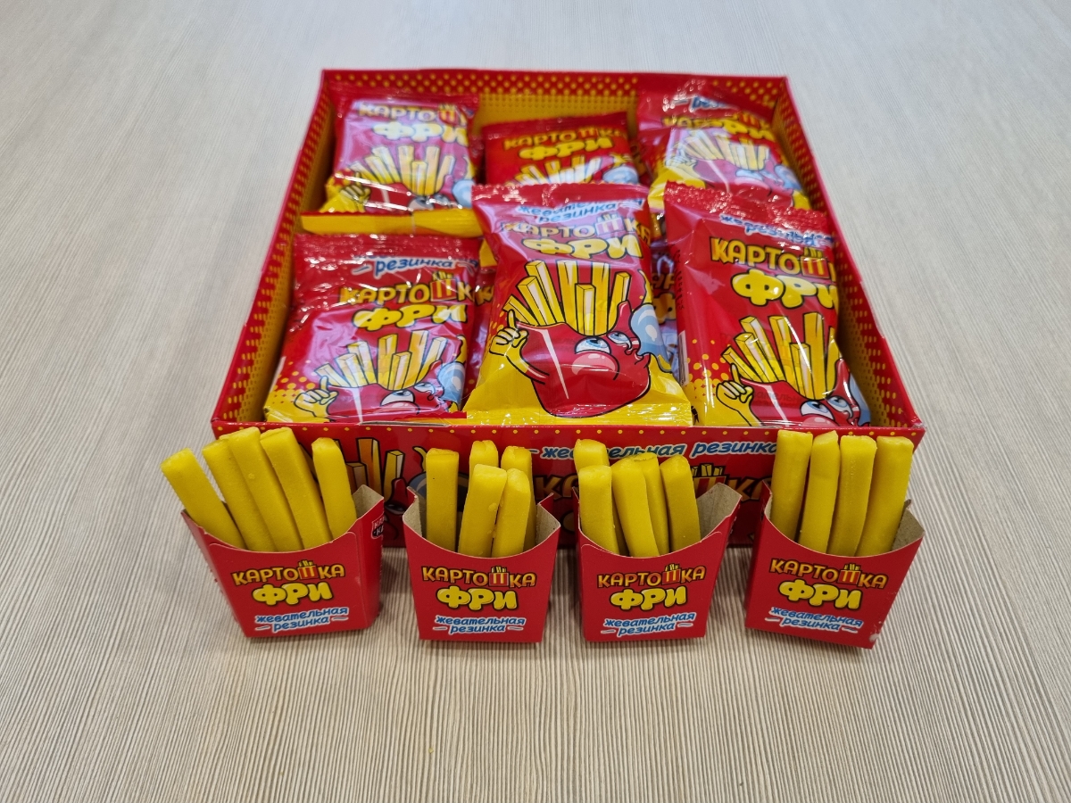 Условия хранения:Хранить в сухом и прохладном месте при температуре от 1 °С до 25 °С и относительной влажности воздуха не более 75%. Избегать попадания прямых солнечных лучей.Состав:Сахар, резиновая основа, глюкозный сироп, глюкоза, ароматизатор (тутти-фр