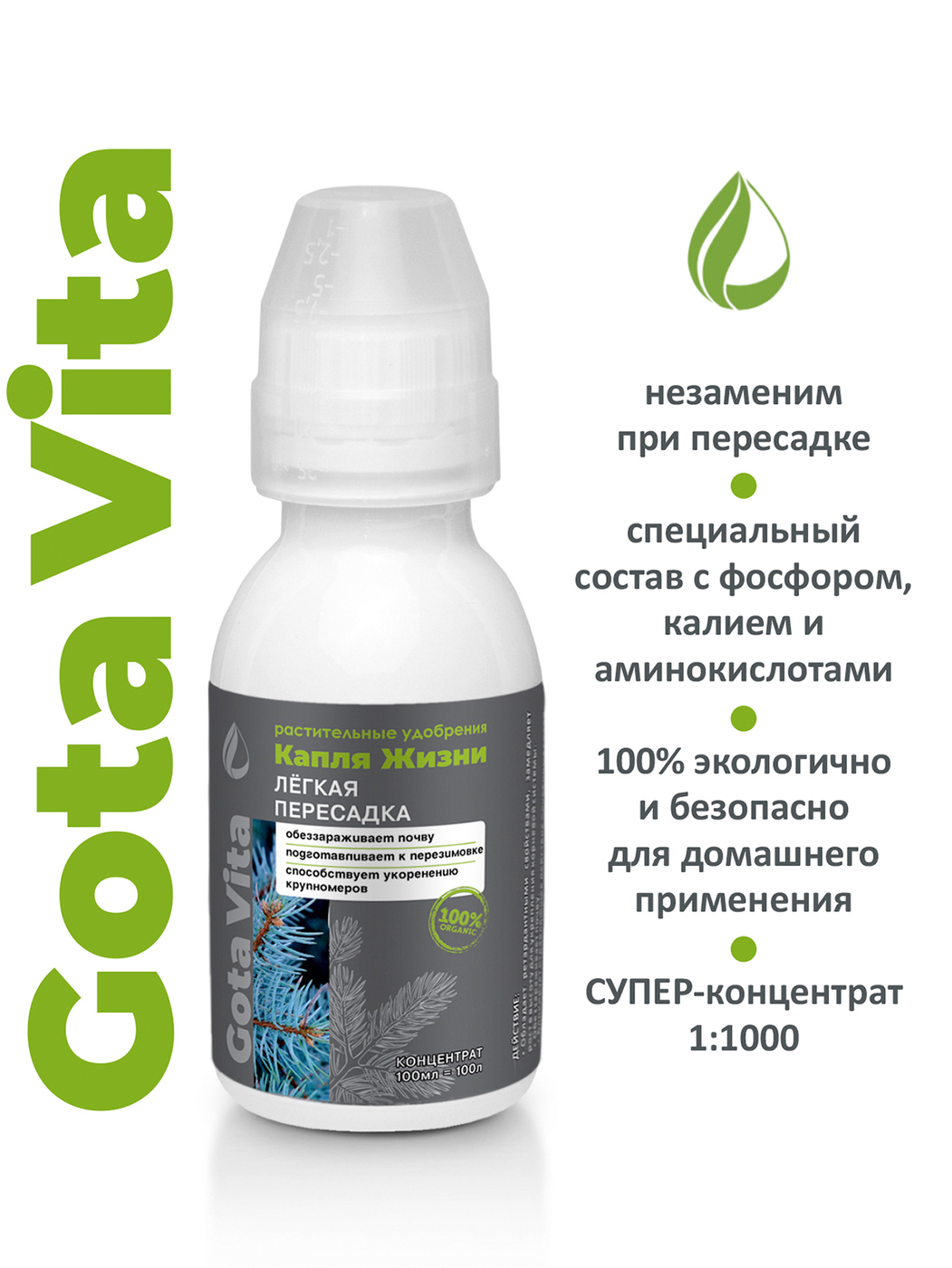Комплектация:ФлаконОписание:Суперконцентрат 100 мл разводится на 100 литров воды.Разведите комплексное удобрение в пропорциях один к ста (мерный колпачок с нашей бутылочки вам поможет), и полейте почву сразу после пересадки. Достаточно всего одного полива