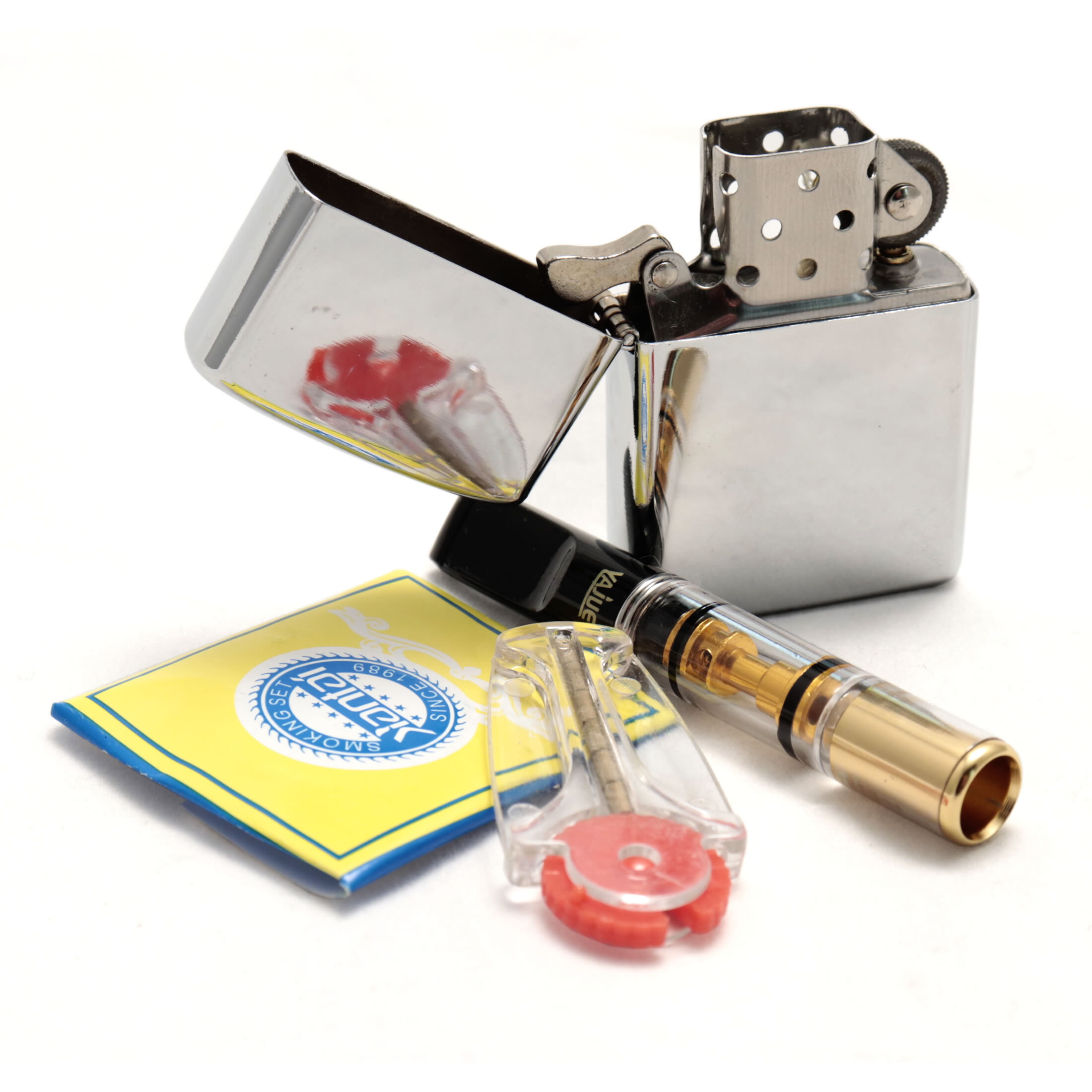 Комплект: зажигалка, запасной фитиль, 6 кремней + мундштук для сигарет и самокруток