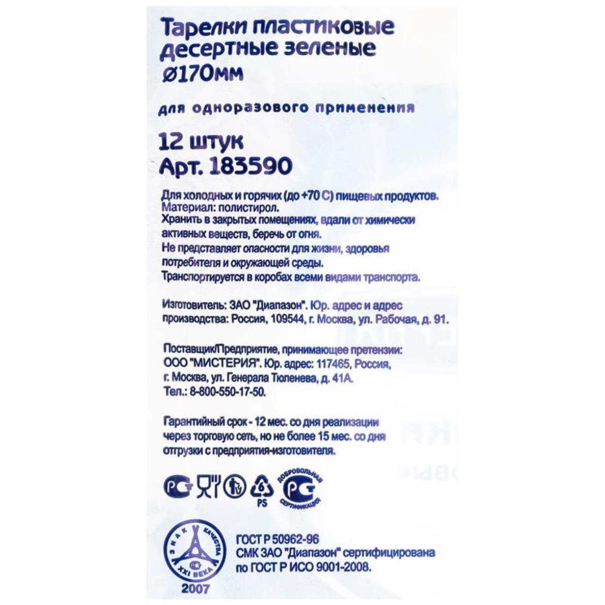Тарелки одноразовые диаметр 17 см зеленые 60 штук Мистерия