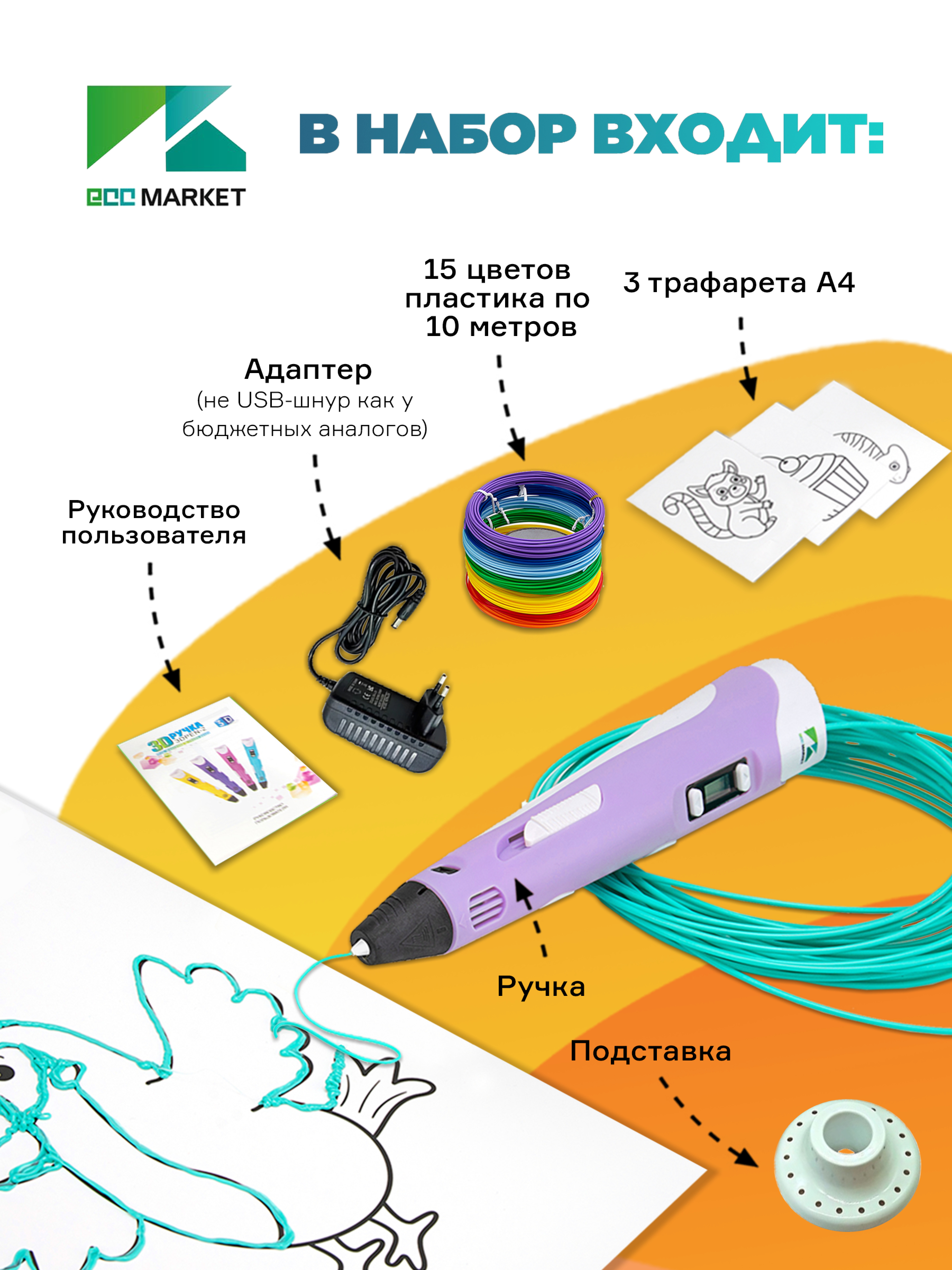 3D ручка 3Dpen2 фиолетовая с набором дополнительного пластика "РАДУГА" (большой) и трафаретами