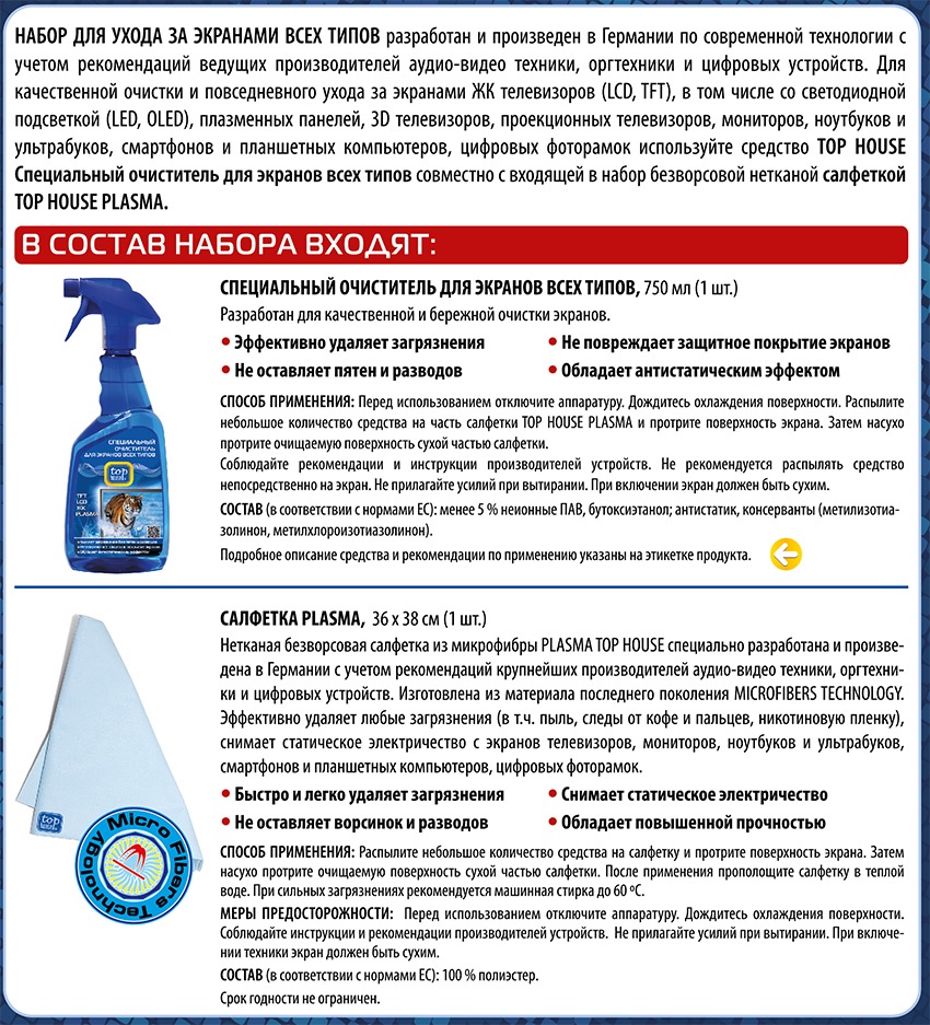 Набор для ухода за экранами всех типов Top House, 2 предмета. Уцененный товар