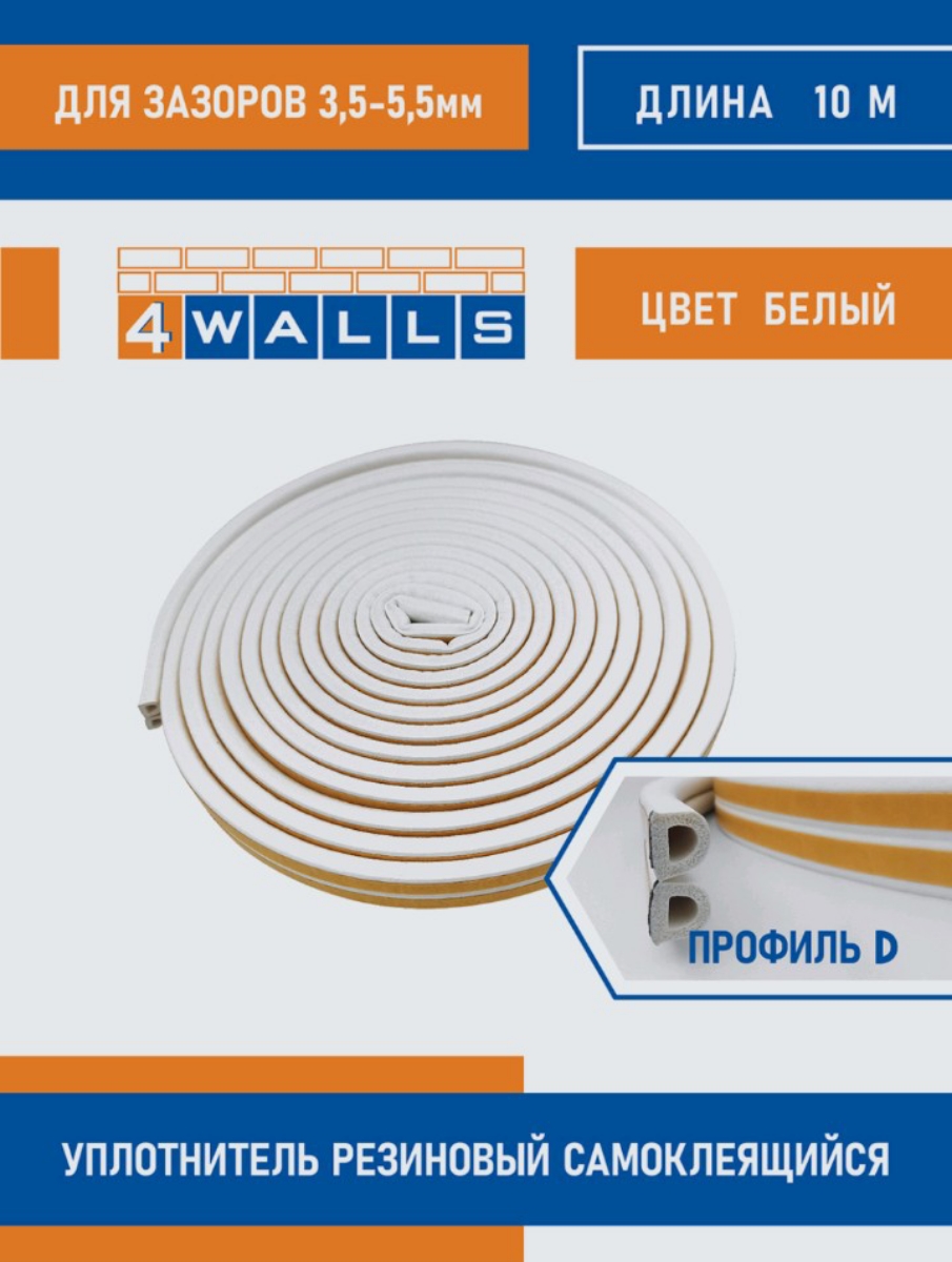 Уплотнитель резиновый самоклеящийся, D-профиль 10 м, белый, для окон и дверей, для щелей 3,5-5,5 мм