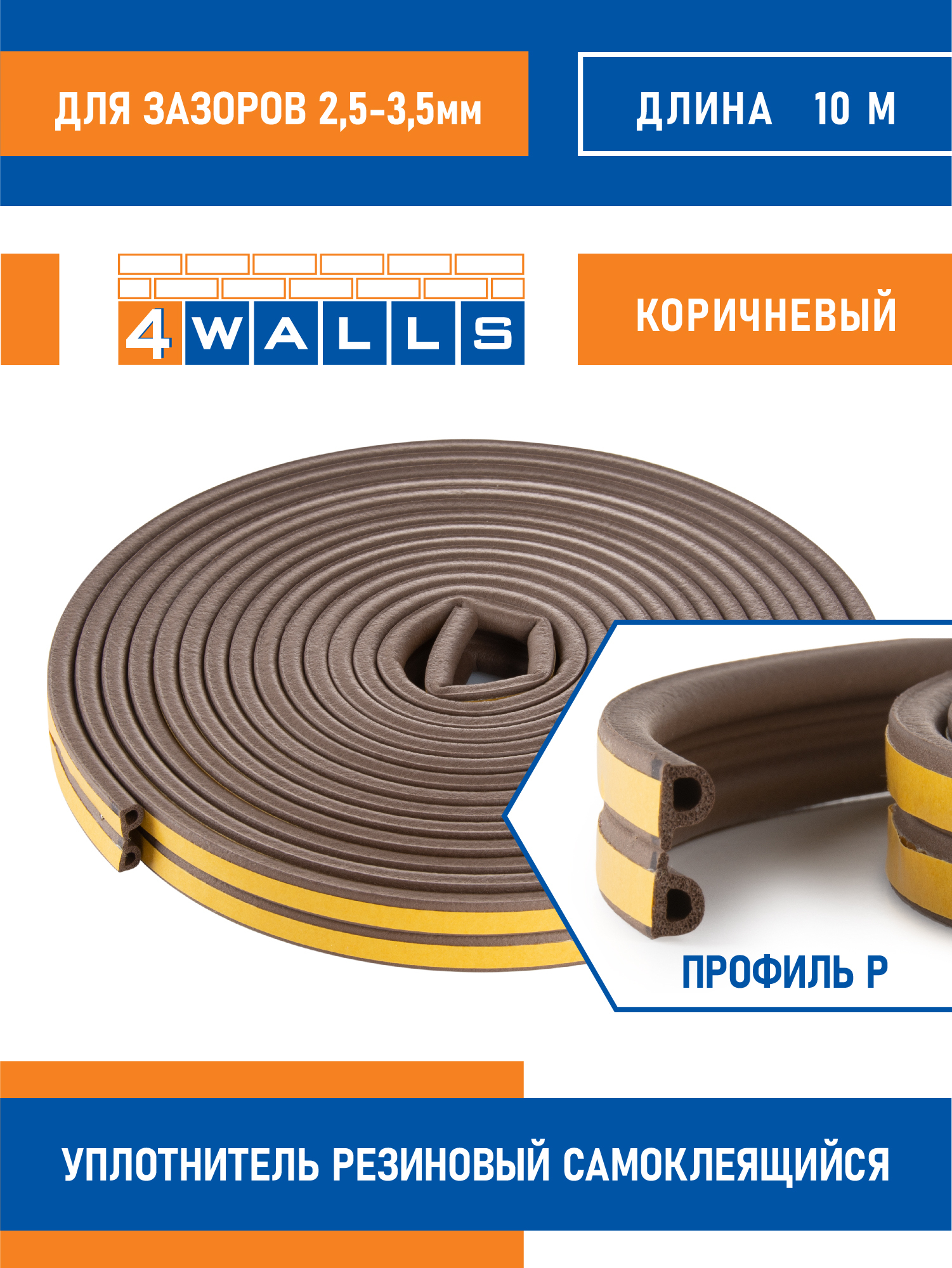 Уплотнитель самоклеящийся, D-профиль 10 м, коричневый, для окон и дверей, для зазоров 3,5-5,5 мм