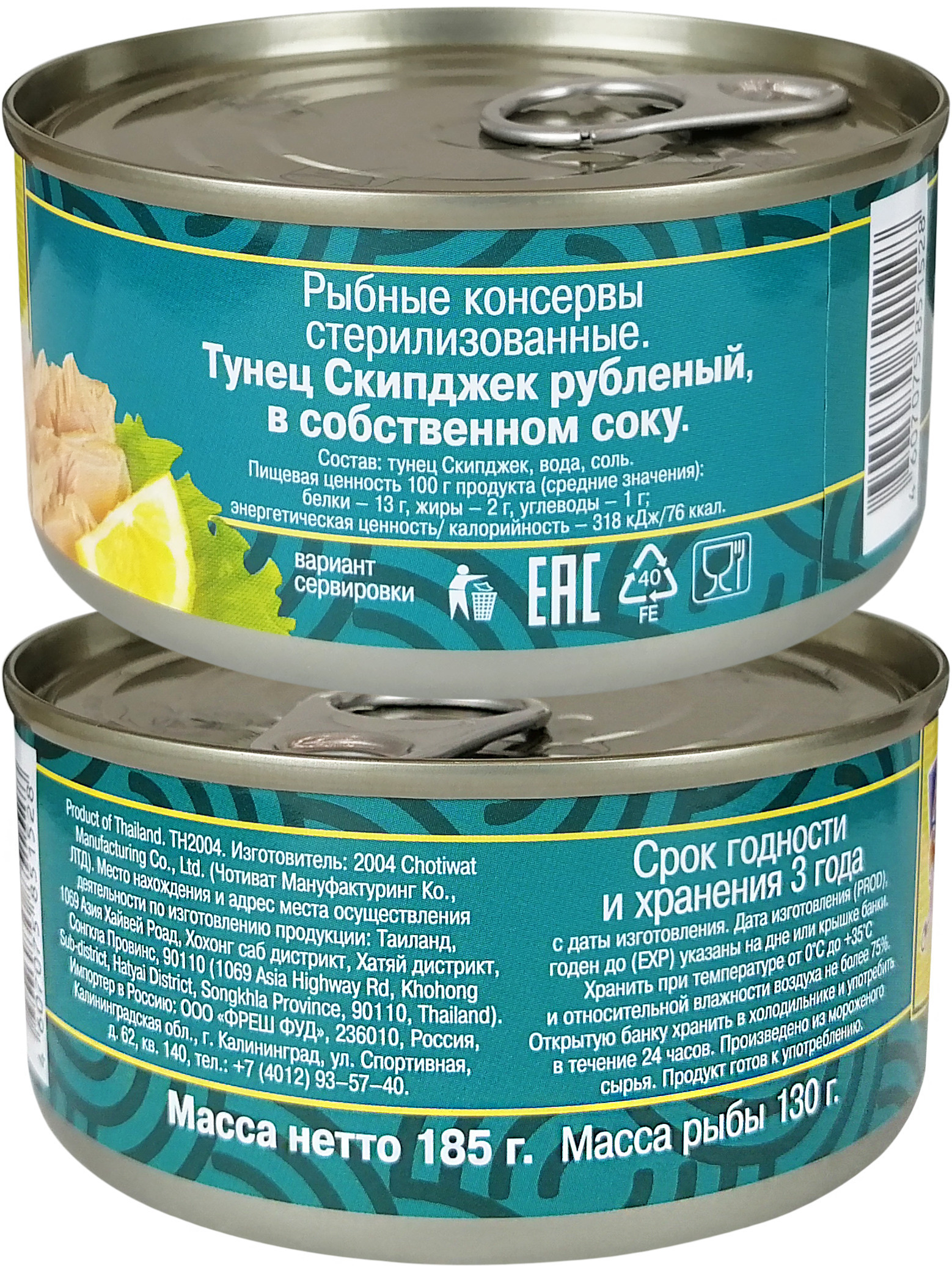 Консервы рыбные 5 Морей - Тунец рубленый в собственном соку, 185 г - 2 шт