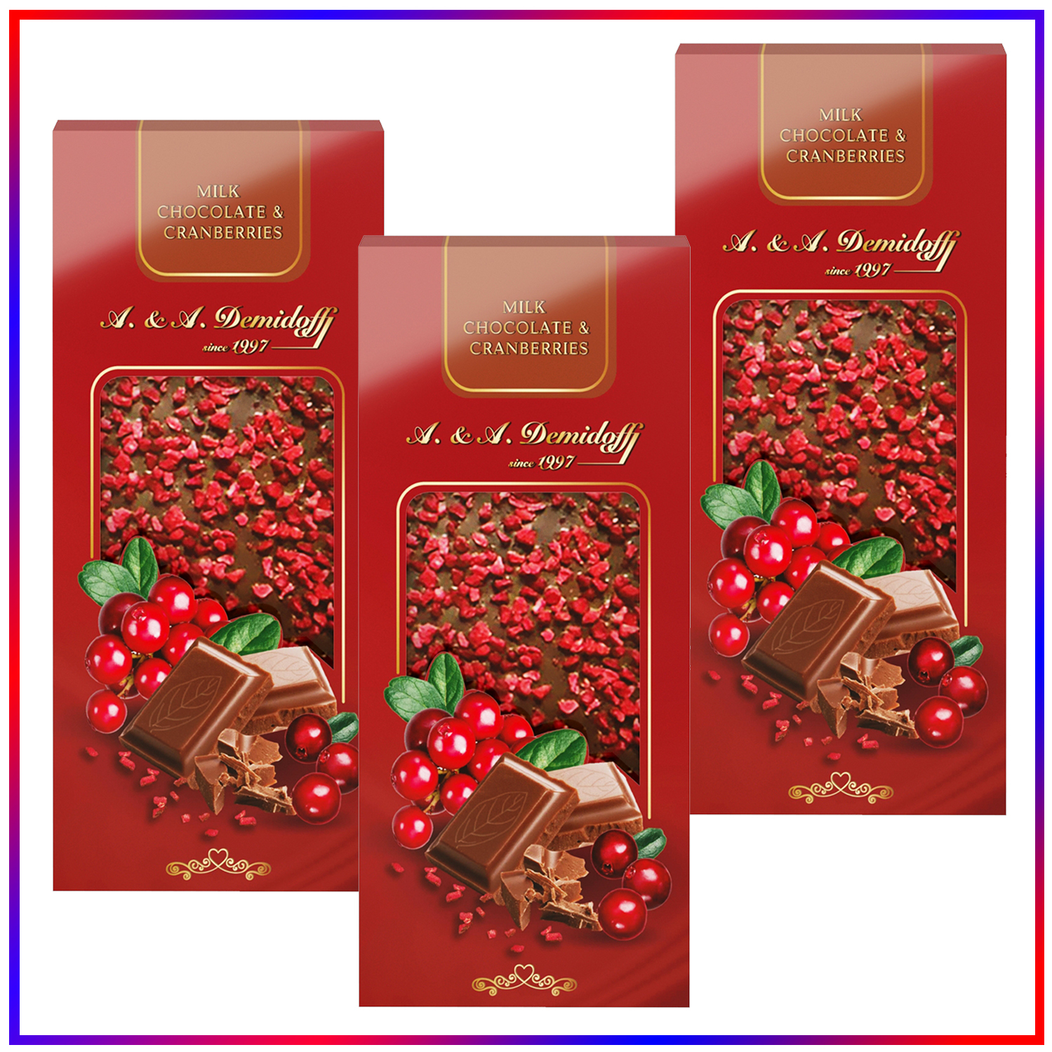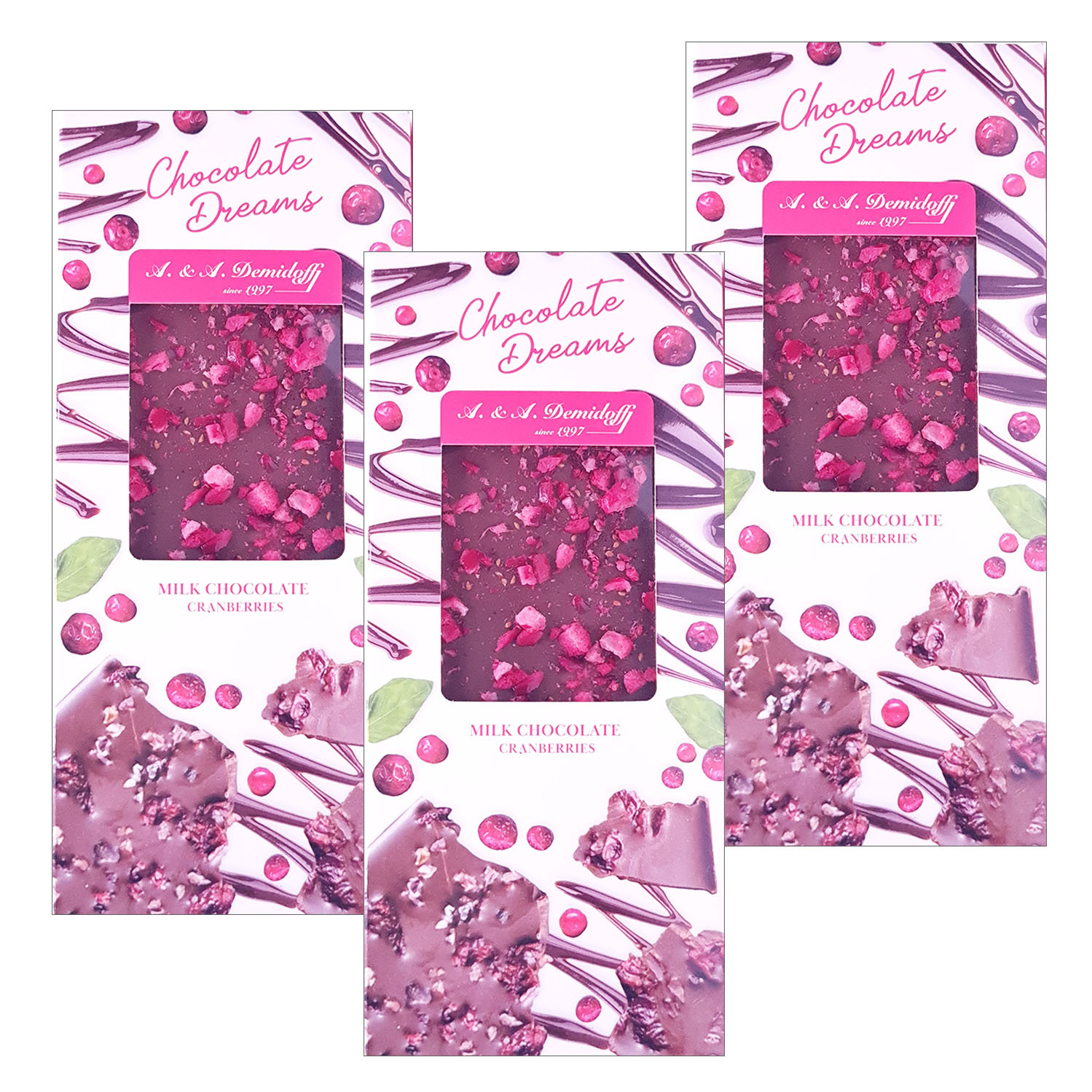 Шоколад молочный A. & A. DEMIDOFF с кусочками сушеной клюквы, NEW, 3 шт по 90 гр