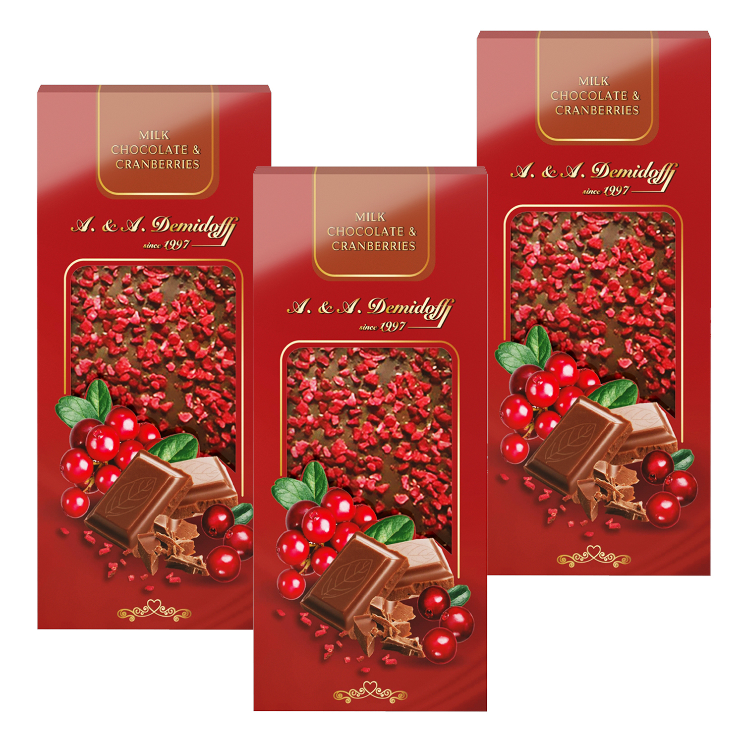 Шоколад молочный A. & A. DEMIDOFF с кусочками сушеной клюквы, 3 шт по 90 гр