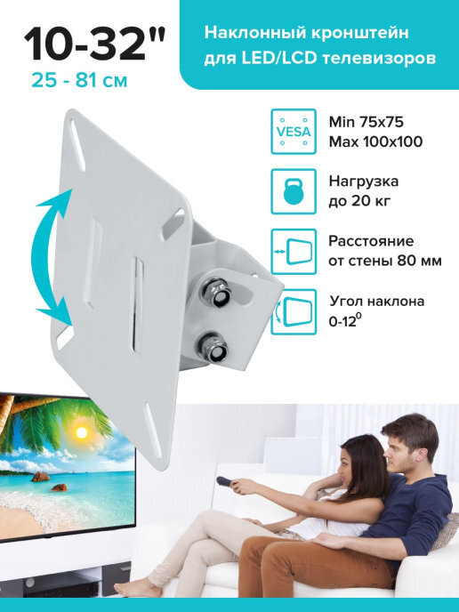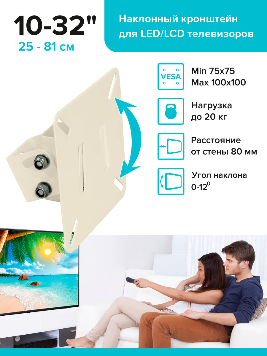 Кронштейн для телевизора настенный Наклонный 20кг 10-32 белый. Absolute Comfort. Держатель для телевизора vesa. Крепление для телевизора.