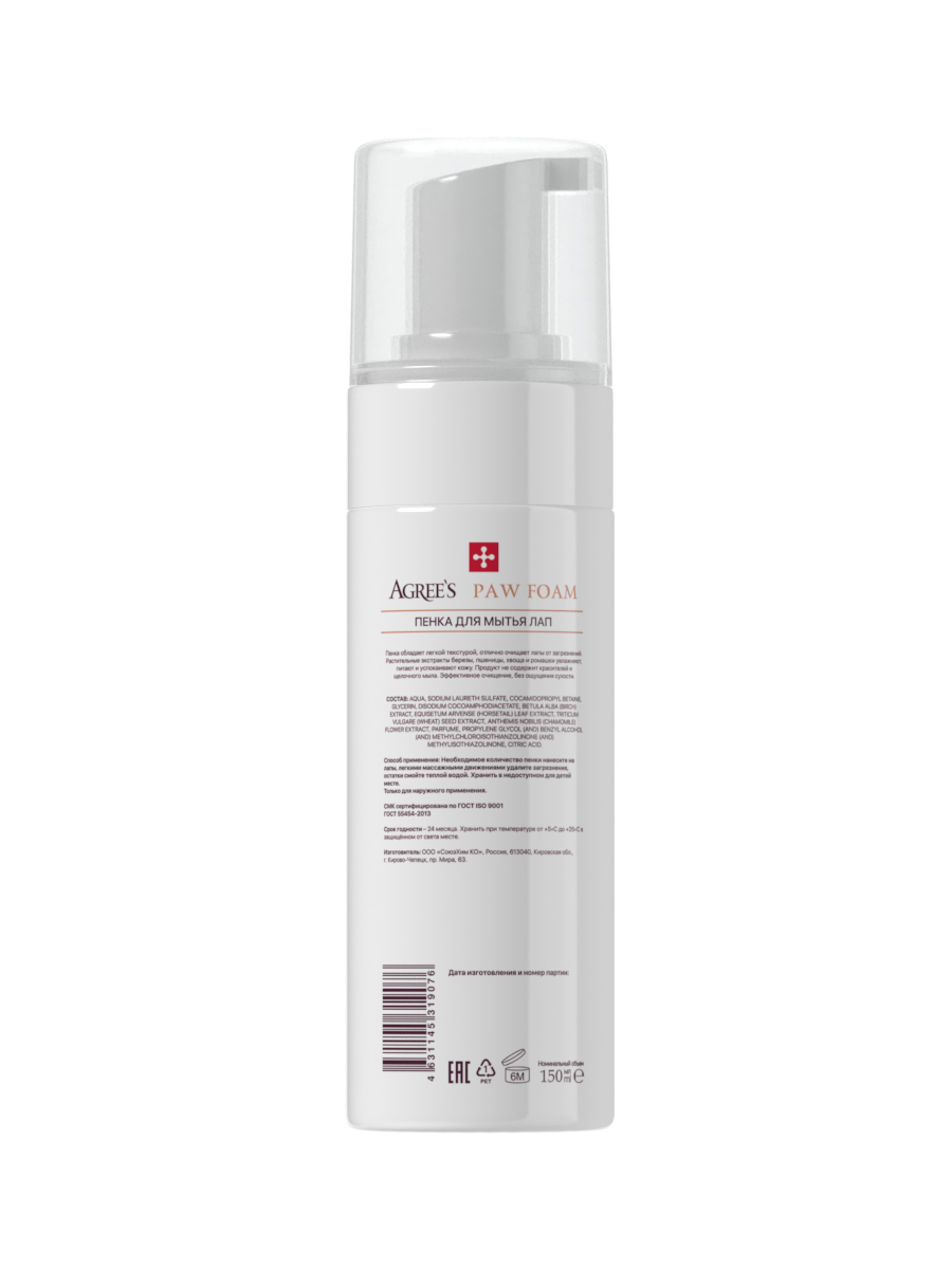 Пенка для животных Agrees for pets PAW FOAM, для мытья лап после прогулки, 150мл