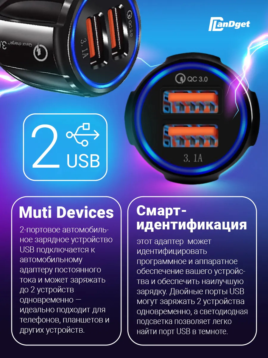 Автомобильное зарядное устройство на 3 USB 7А / Быстрая зарядка QC 3.0 / АЗУ / Блок питания белый