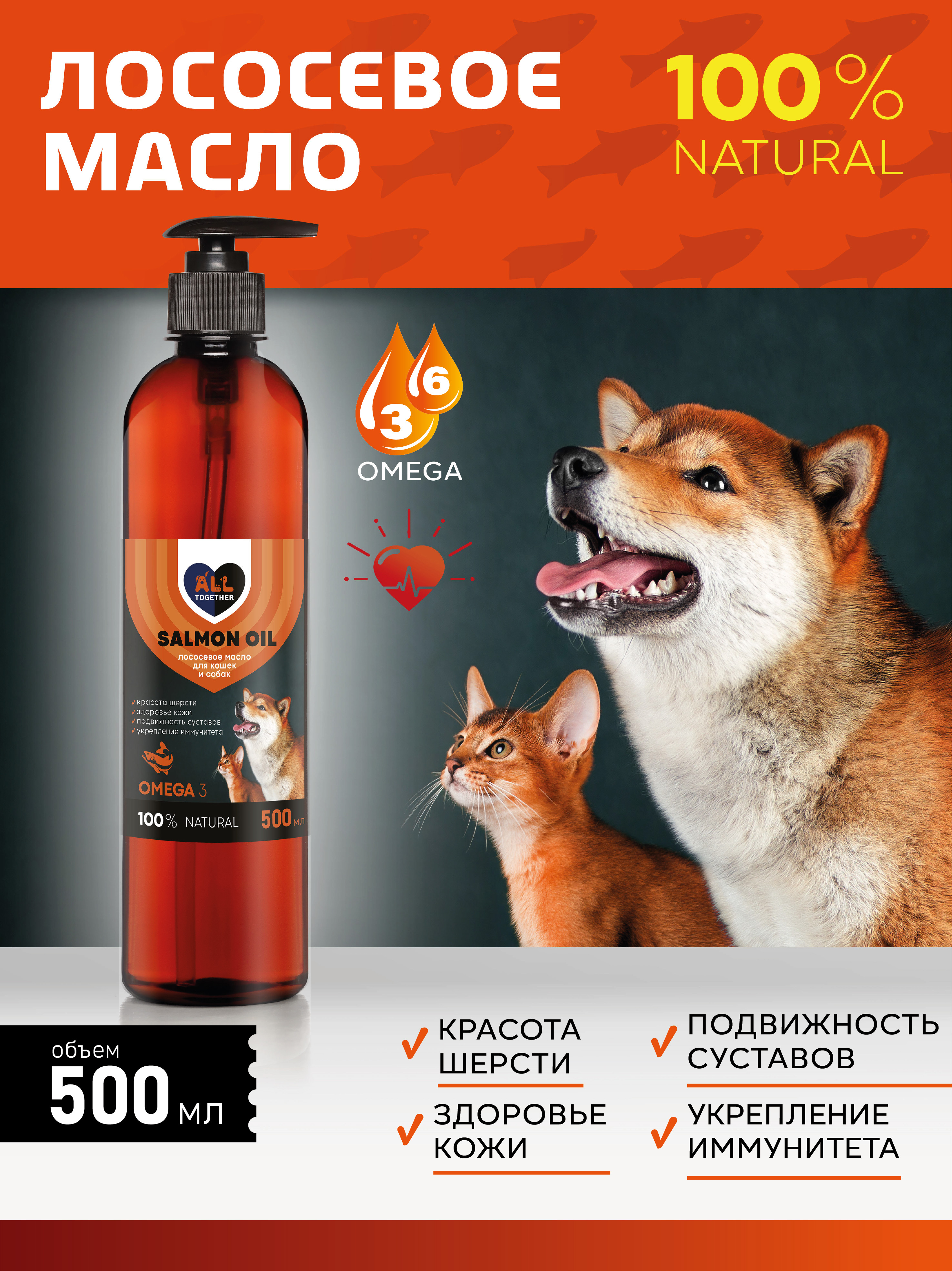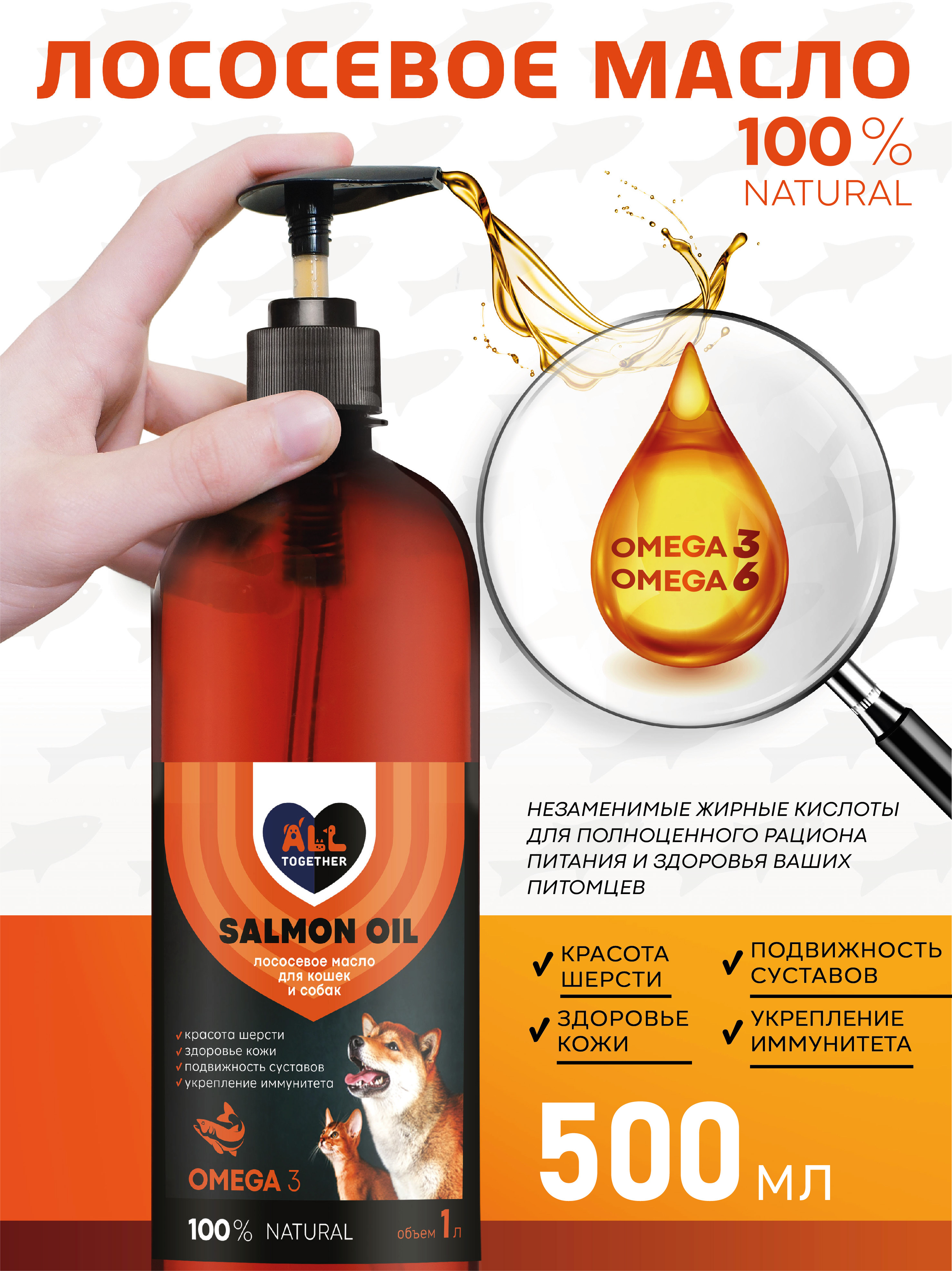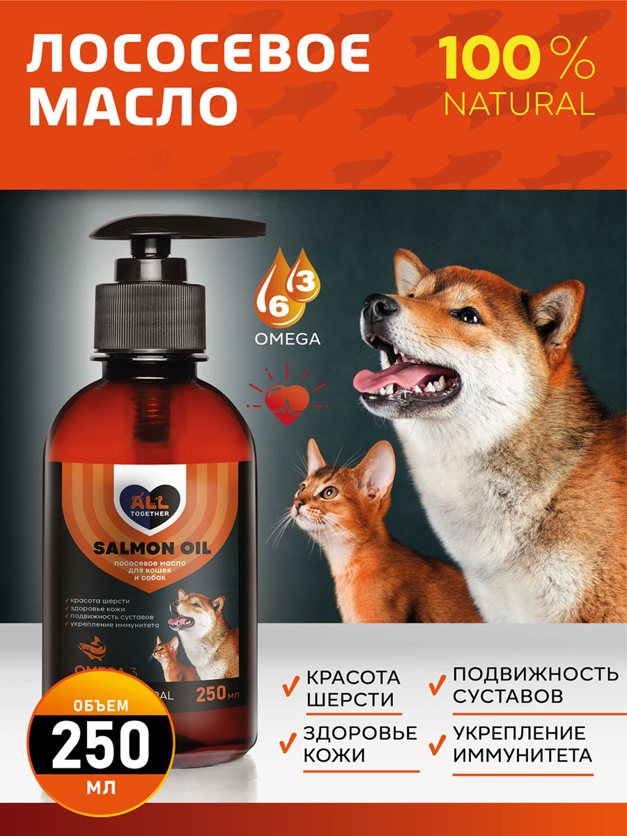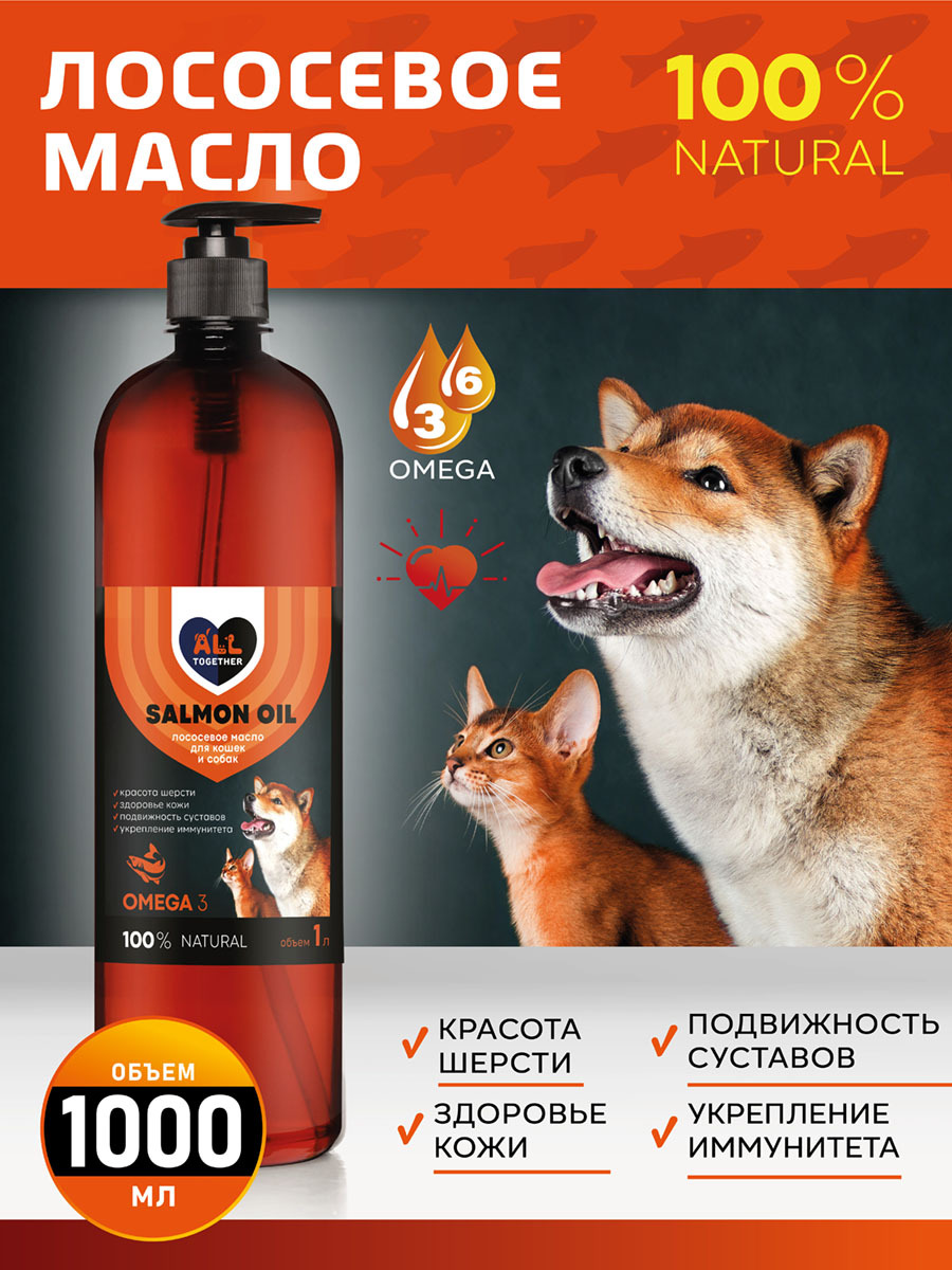 Лососевое масло для собак и кошек Омега 3 / масло лосося для животных Омега 6 / 500 мл