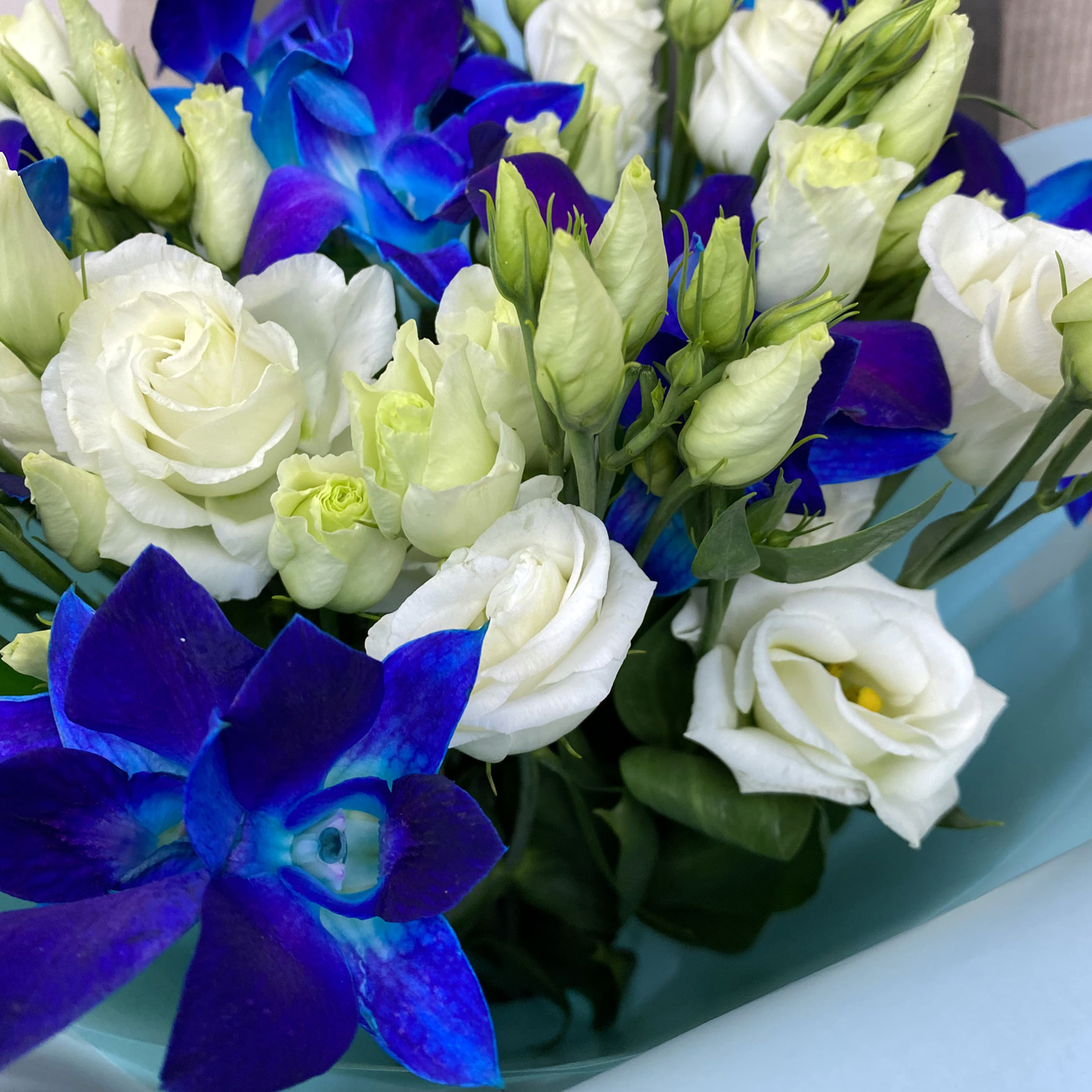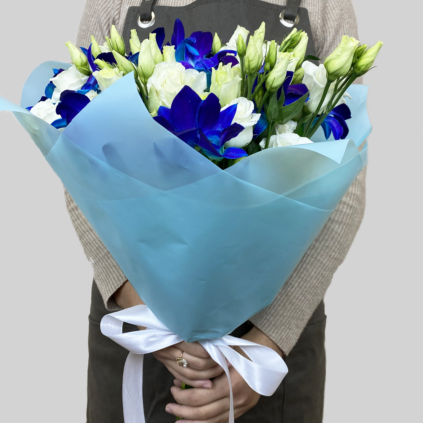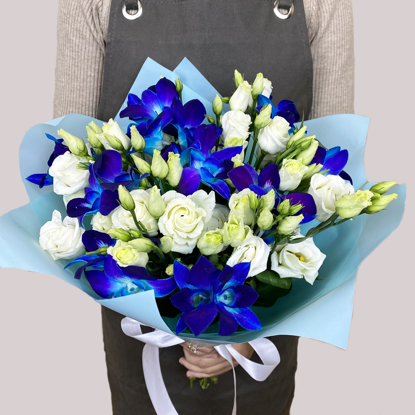Лизиантус с космическими орхидеями. Букет 144 ALMOND ROSES