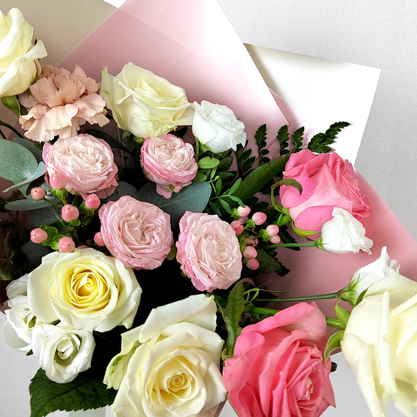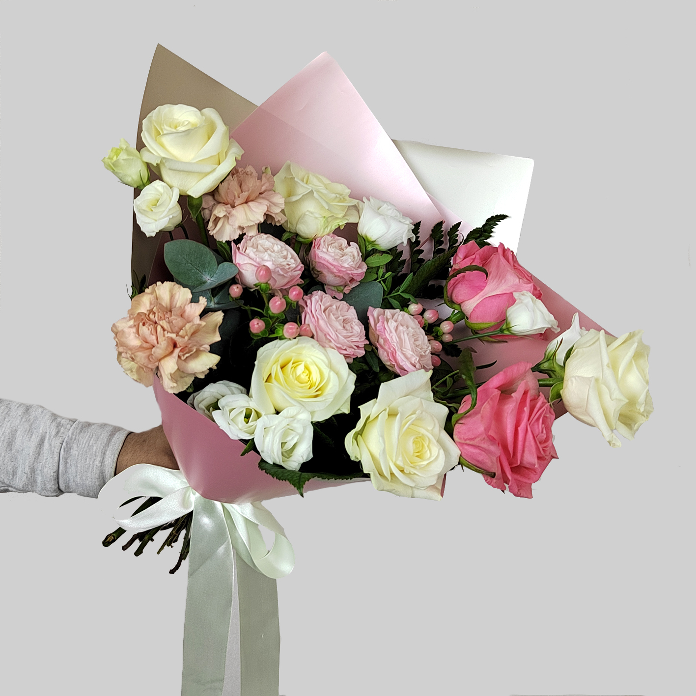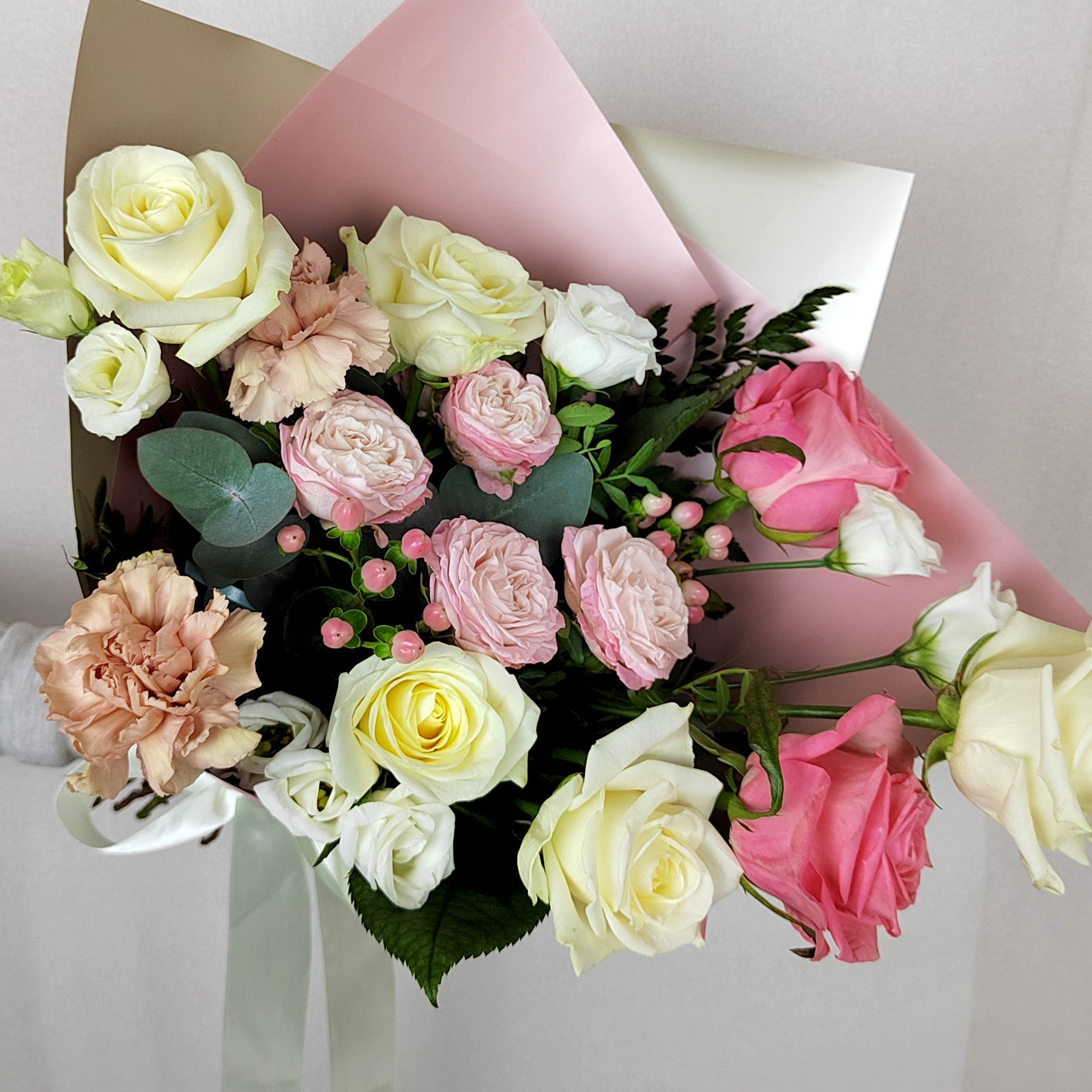 Лизиантус с космическими орхидеями. Букет 144 ALMOND ROSES