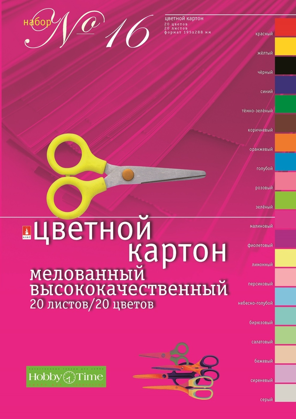 Картон цветной Альт 20 листов, 20 цветов, А4, мелованный