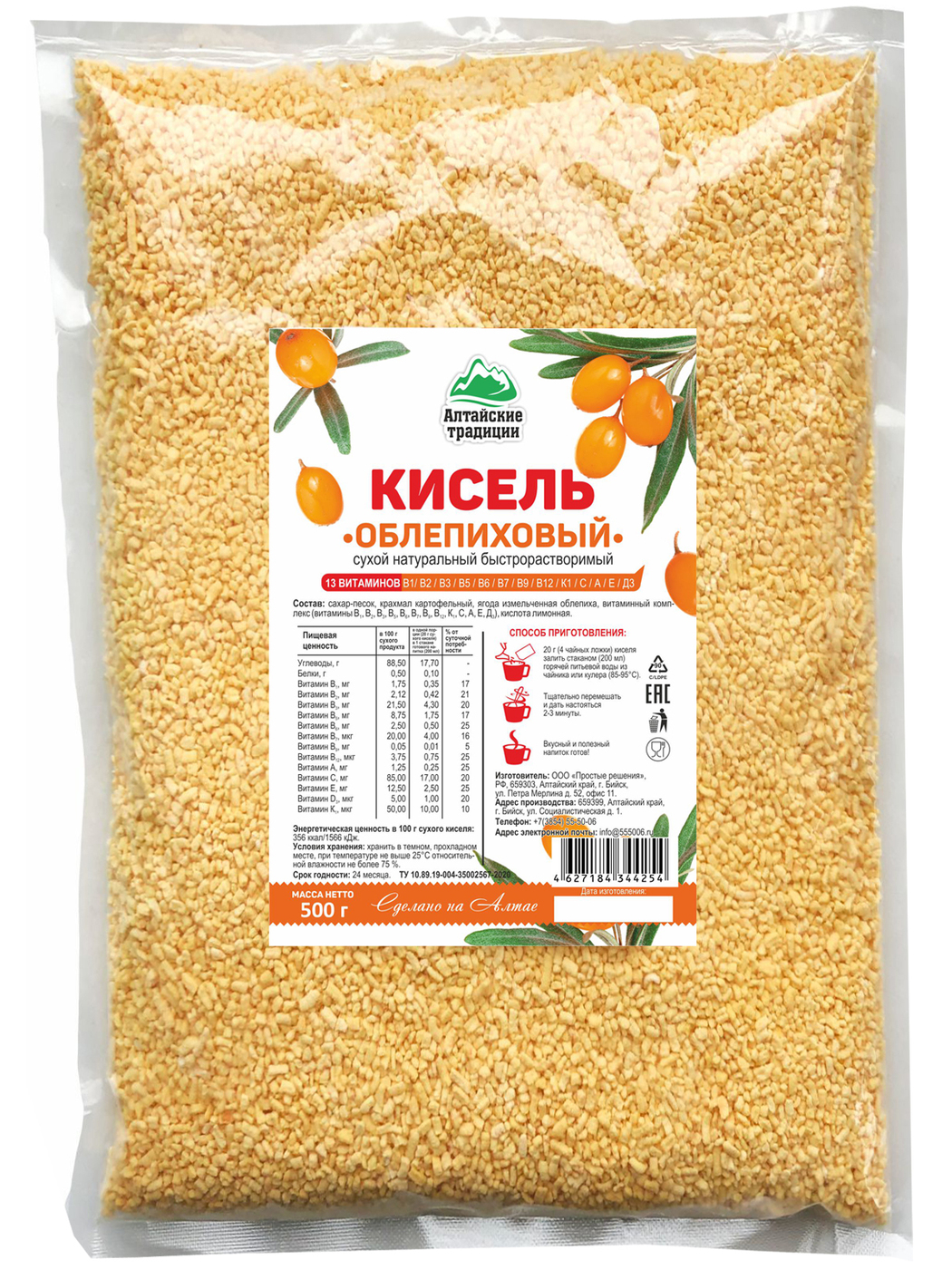 Натуральный витаминизированный кисель Облепиховый, Алтайские традиции, 500 г