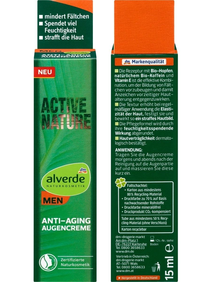 Alverde MEN Антивозрастной крем для кожи вокруг глаз Active Nature с хмелем и маслом авокадо, 15 мл