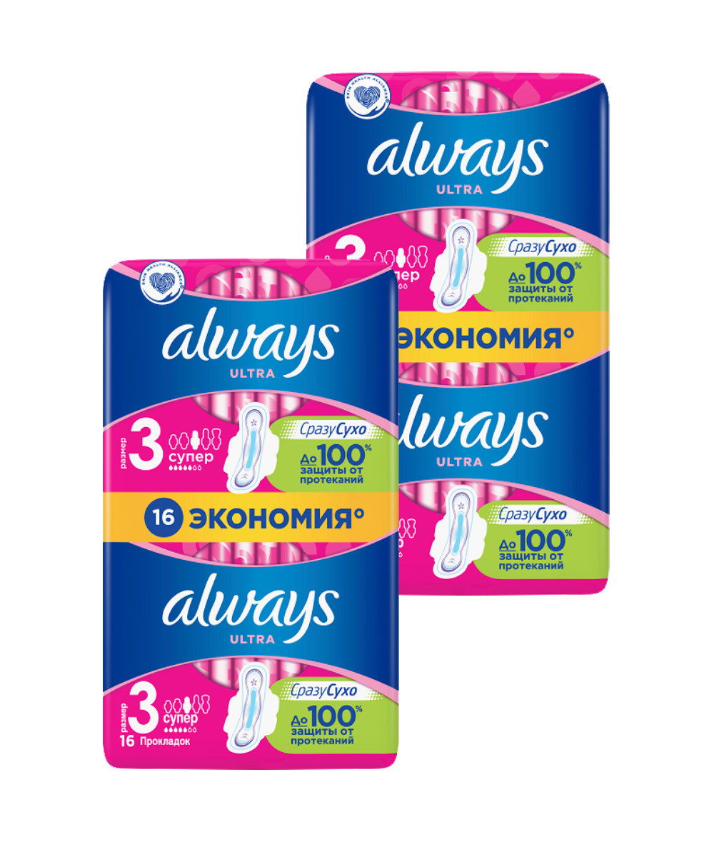 Always Duo Ultra Super, набор из ДВУХ упаковок прокладок гигиенических по 16 шт (32 шт)