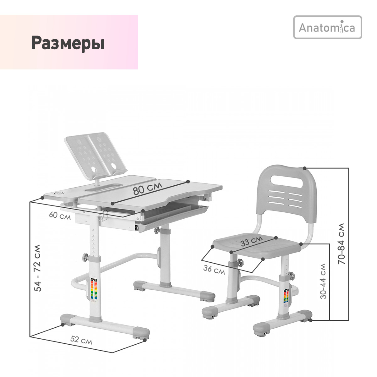 Комплект парта + стул, Парта Трансформер Anatomica Amata, 80х60х54 см
