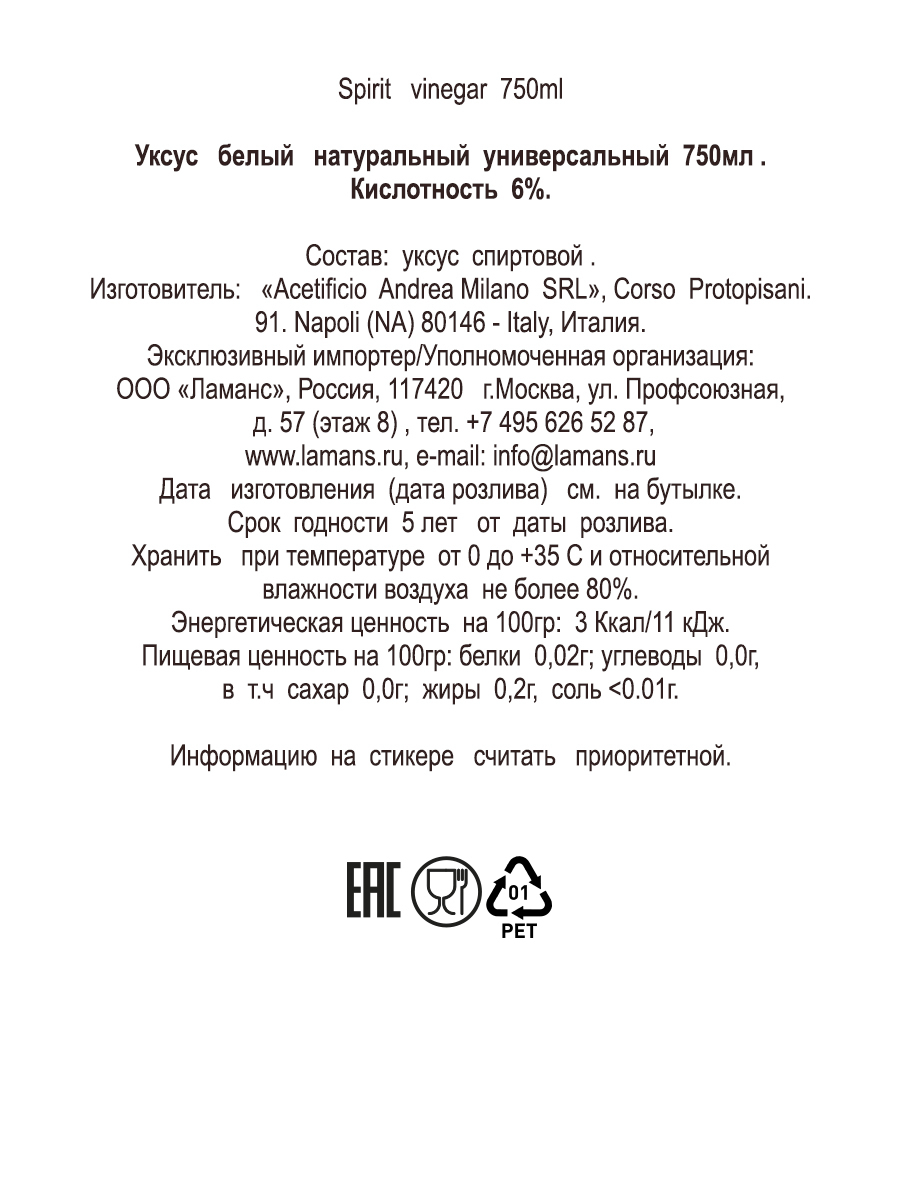 Уксус белый натуральный универсальный 750 мл, спрей "SPLENDIACETO", пэт/б (Италия)