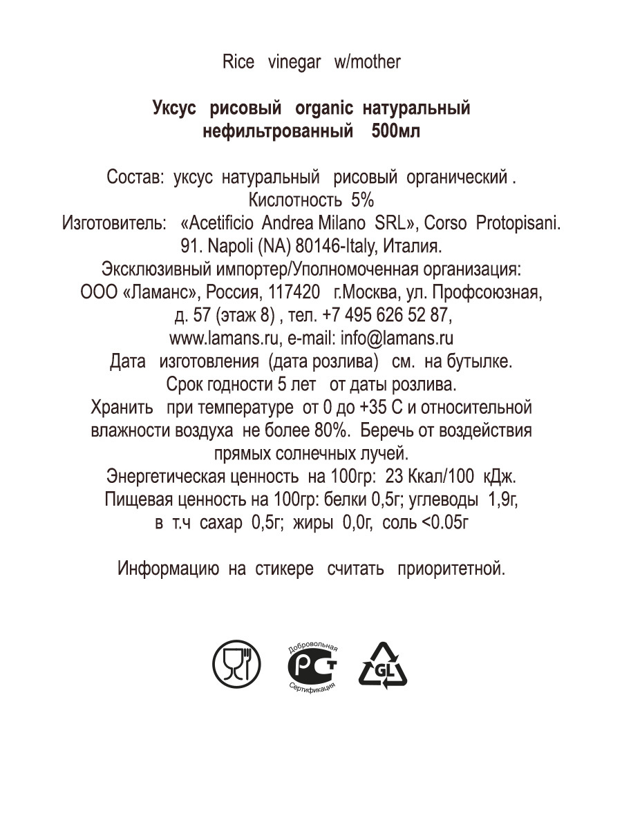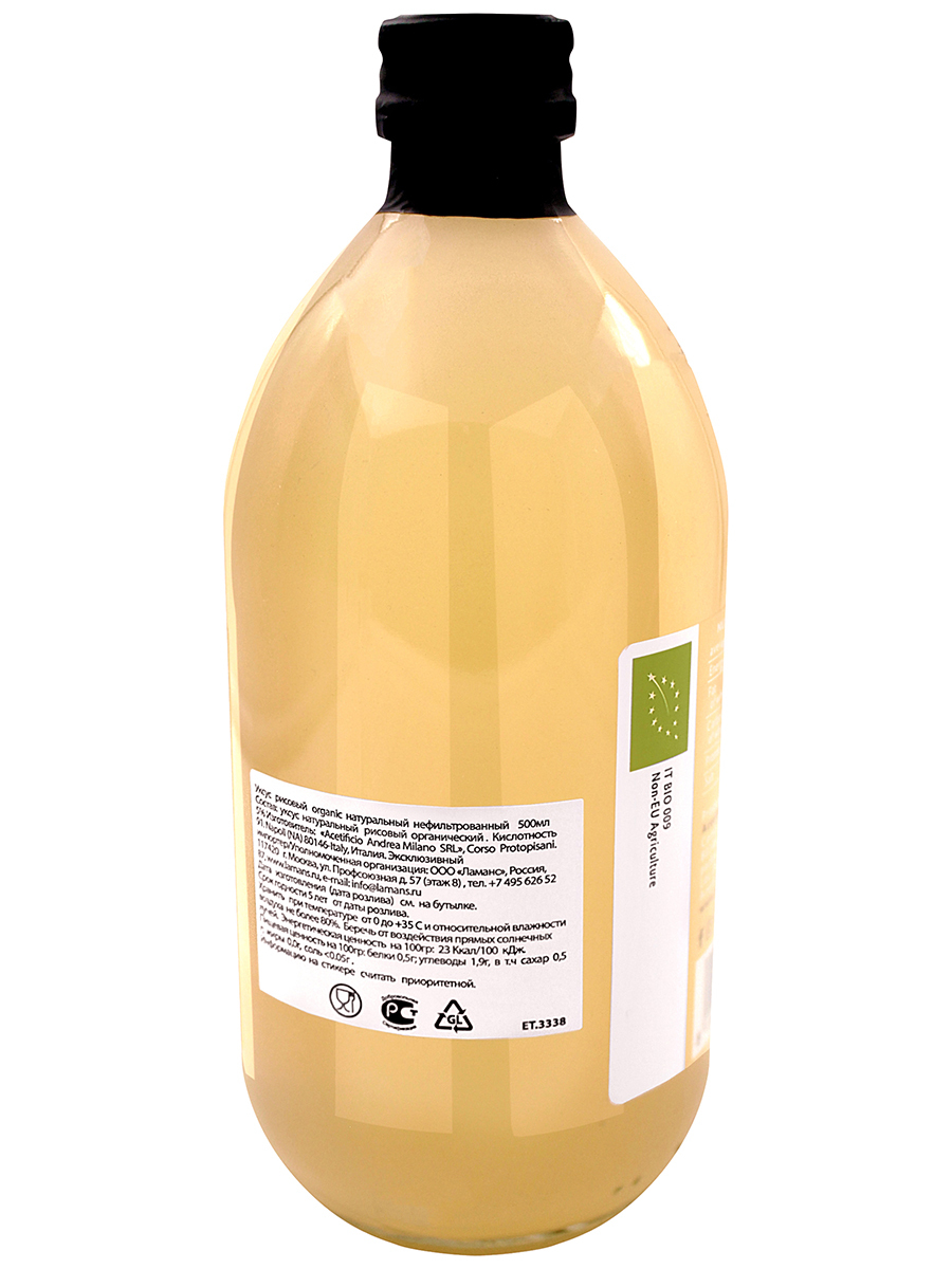 Уксус рисовый organic нефильтрованный 5 % "DETO ANDREA MILANO" 500мл ст/б (Италия)