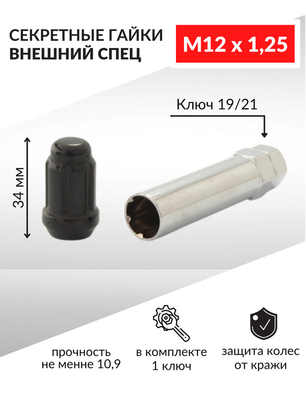 Гайки-секретки, Гайка колеса автомобильная М12 х 1,25, 20 шт.