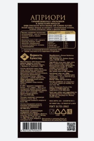 Шоколад горький с цукатами апельсина и лепестками миндаля, АПРИОРИ, 100г х 3 шт
